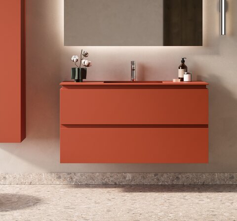 Dokonalá shoda: Nábytek AMIATA se dvěma zásuvkami a umyvadlem CS Oval 55x36 na desce v kombinaci s plnobarevnou vanou Manila od společnosti KAROL v provedení Mineralmarmo, obojí v matném provedení Terracotta. Dodejte neutrálním odstínům prostoru vaší koupelny barevný nádech.