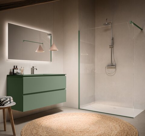 WALK-IN EASY One Color v Břidlicově šedá matná – dokonale sladěné s barvou AMIATA se dvěma zásuvkami. Sprchová vanička AIR je tónovaná v antracitově šedé barvě a na vyžádání je k dispozici v jakékoli barvě RAL, aby dokonale ladila s jakýmkoliv koupelnovým stylem a WALK-IN EASY One Color v barvě Provazová šedá matná – dokonale sladěné s koupelnovým nábytkem AMIATA.