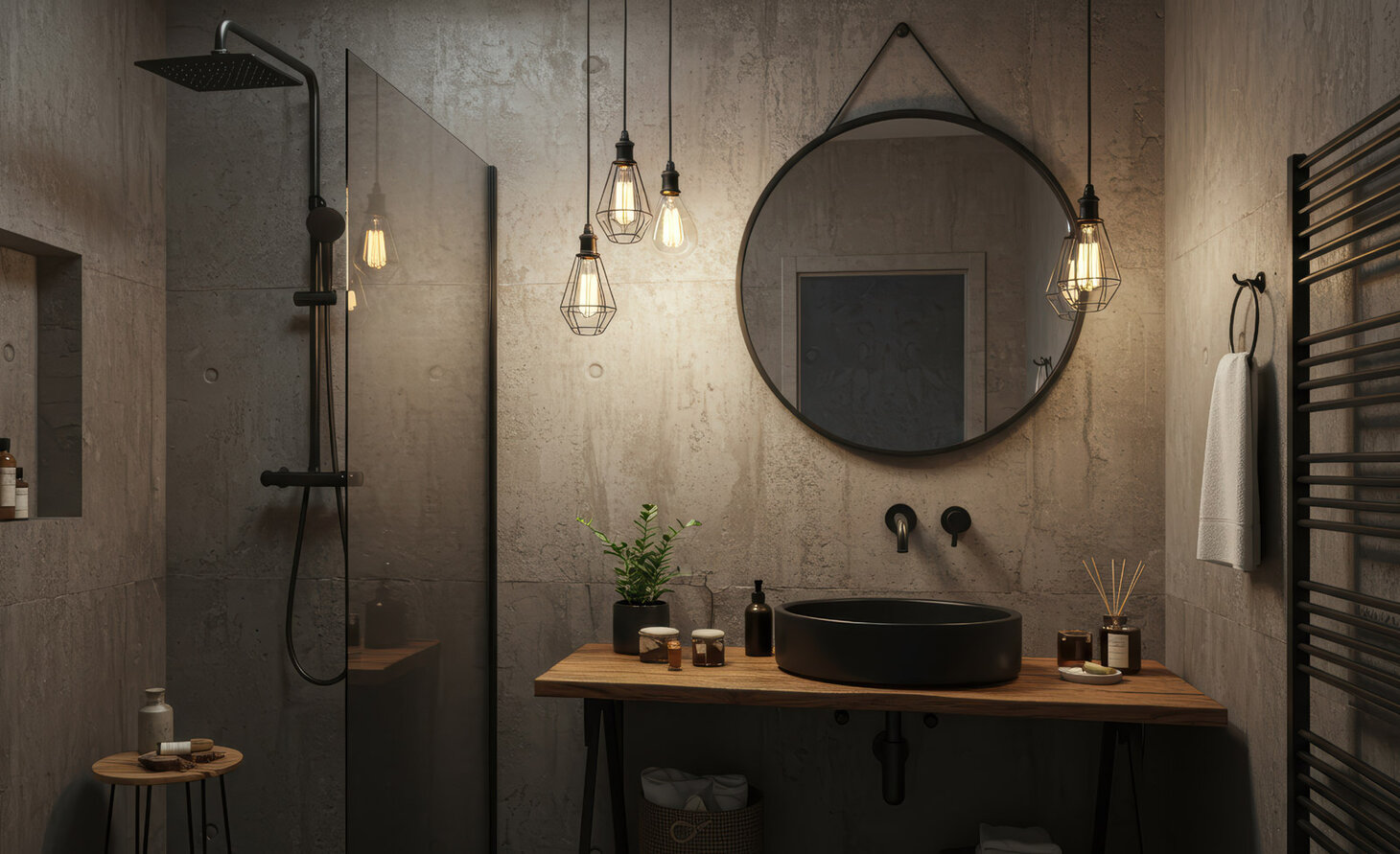 Lighting plays a crucial role in every interior, influencing both functionality and attractiveness. Industrial bathroom designs are perfected when the ceiling features a wire lamp with a metal shade or an Edison bulb. Visible cables, reminiscent of a factory, are desirable. In addition to the main lighting, simple sconces by the mirror are essential, as well as decorative lighting for areas that residents wish to highlight. This will add atmosphere to the industrial sink or shower.