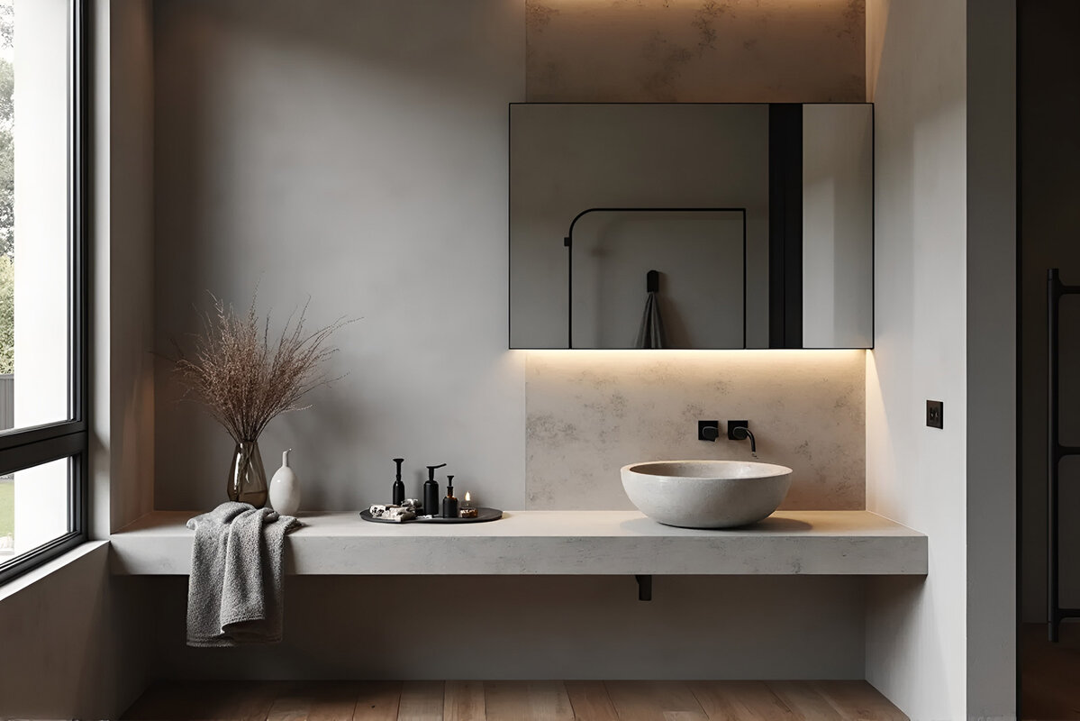 A modern loft bathroom delights with a certain raw charm and still, like the first New York lofts, refers to factory atmospheres. Its decor will be based on a defined color palette. An industrial bathroom should include dark graphite, pigeon gray, dirty white, and black tones. These can be seen in bathroom tiles and furniture. Architectural concrete-effect tiles are particularly recommended. They are easier to install and maintain than raw concrete but imitate it well. As for loft bathroom accessories, they should soften the harshness with warmer shades of copper, bronze, or another brighter, warmer color. A touch of yellow or red will reference industrial warning signs. In addition to concrete, wood and natural brick are also good options.