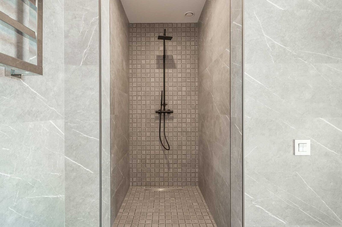 When choosing what tiles to use in the shower cabin instead of a tray, anti-slip tiles are the natural choice, but wall tiles must also be considered. When choosing wall tiles, the priority should be their ease of cleaning, as it is impossible to avoid water residue and cosmetic build-up. Matte tiles work well for shower walls, as dirt is less visible on them.