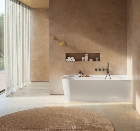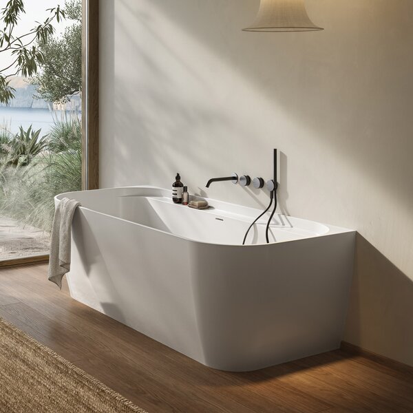 Designed for elegant corner or wall placement, the ANTIGUA and GUADELOUPE bathtubs by GLASS 1989 combine sculptural design with space-saving functionality. Crafted from HardLite, a high-performance solid surface material, both models can be personalized with an exterior colour finish to perfectly match every individual style.