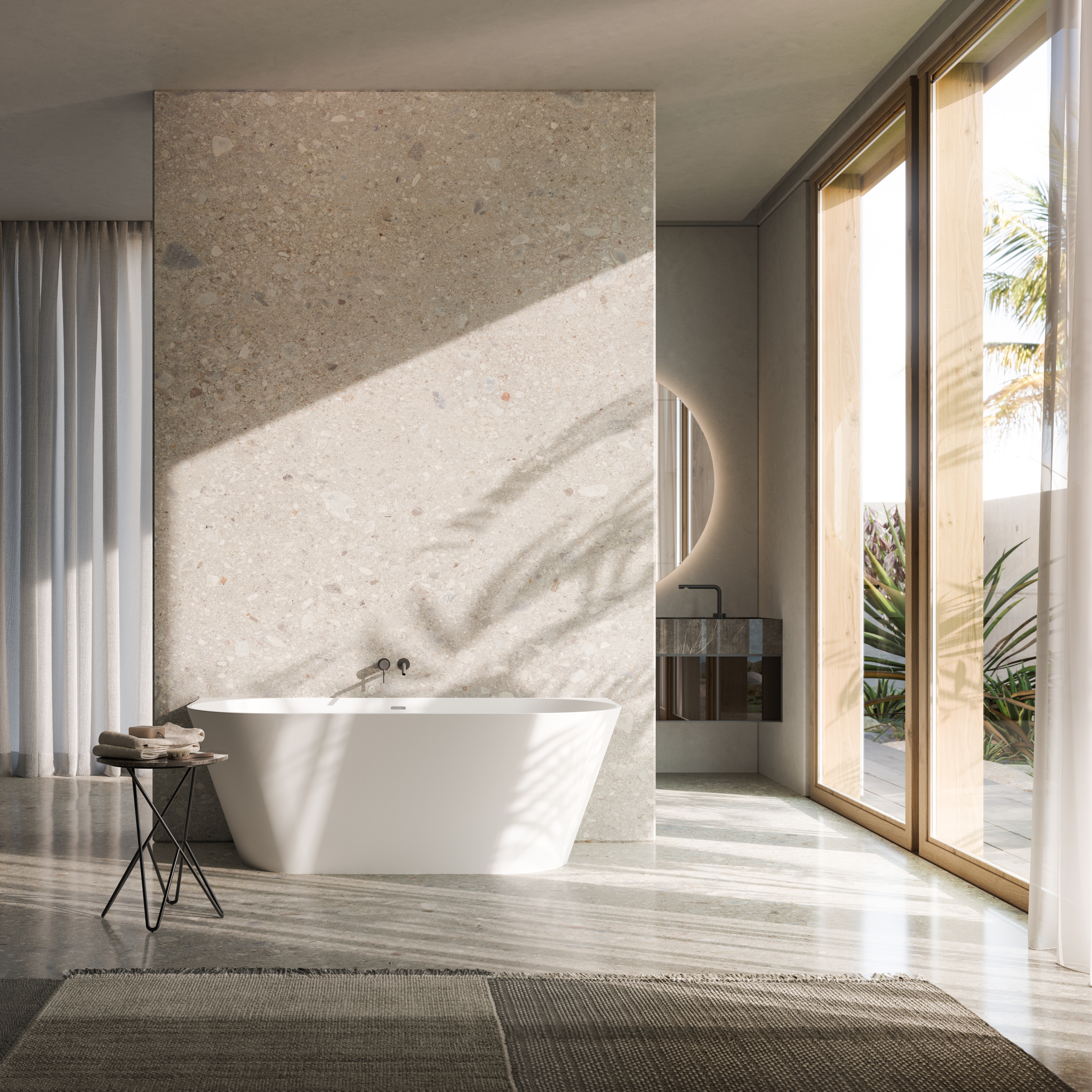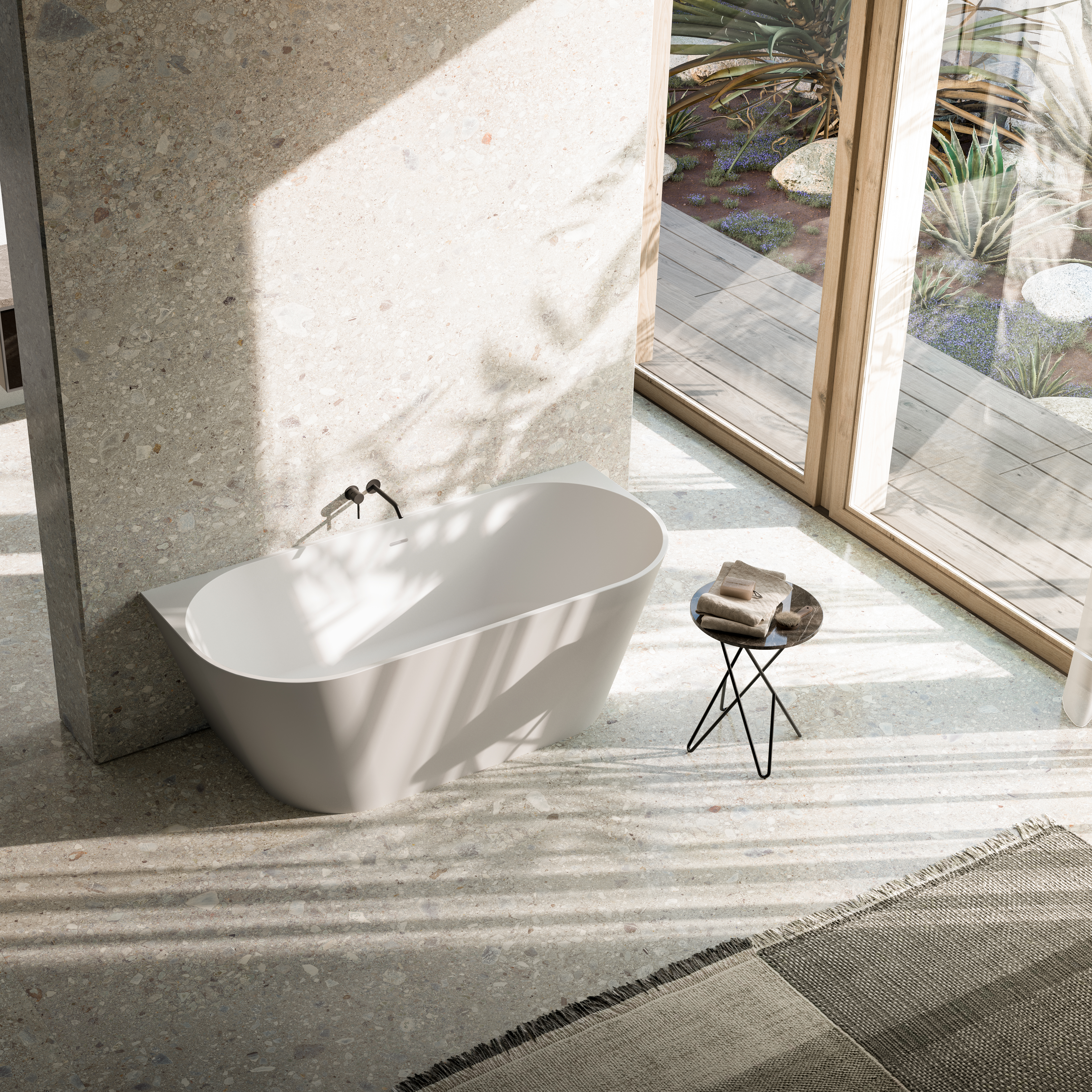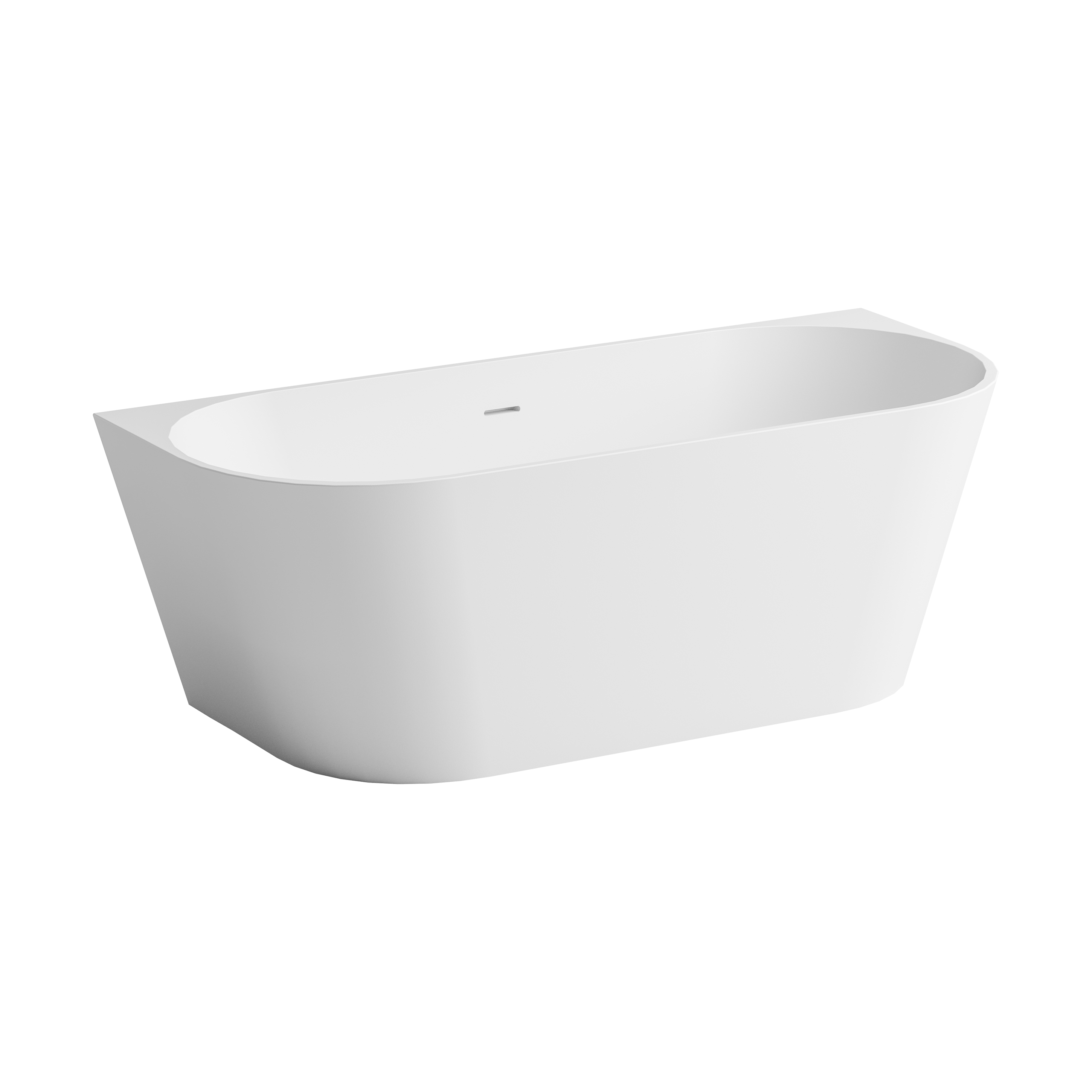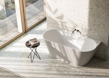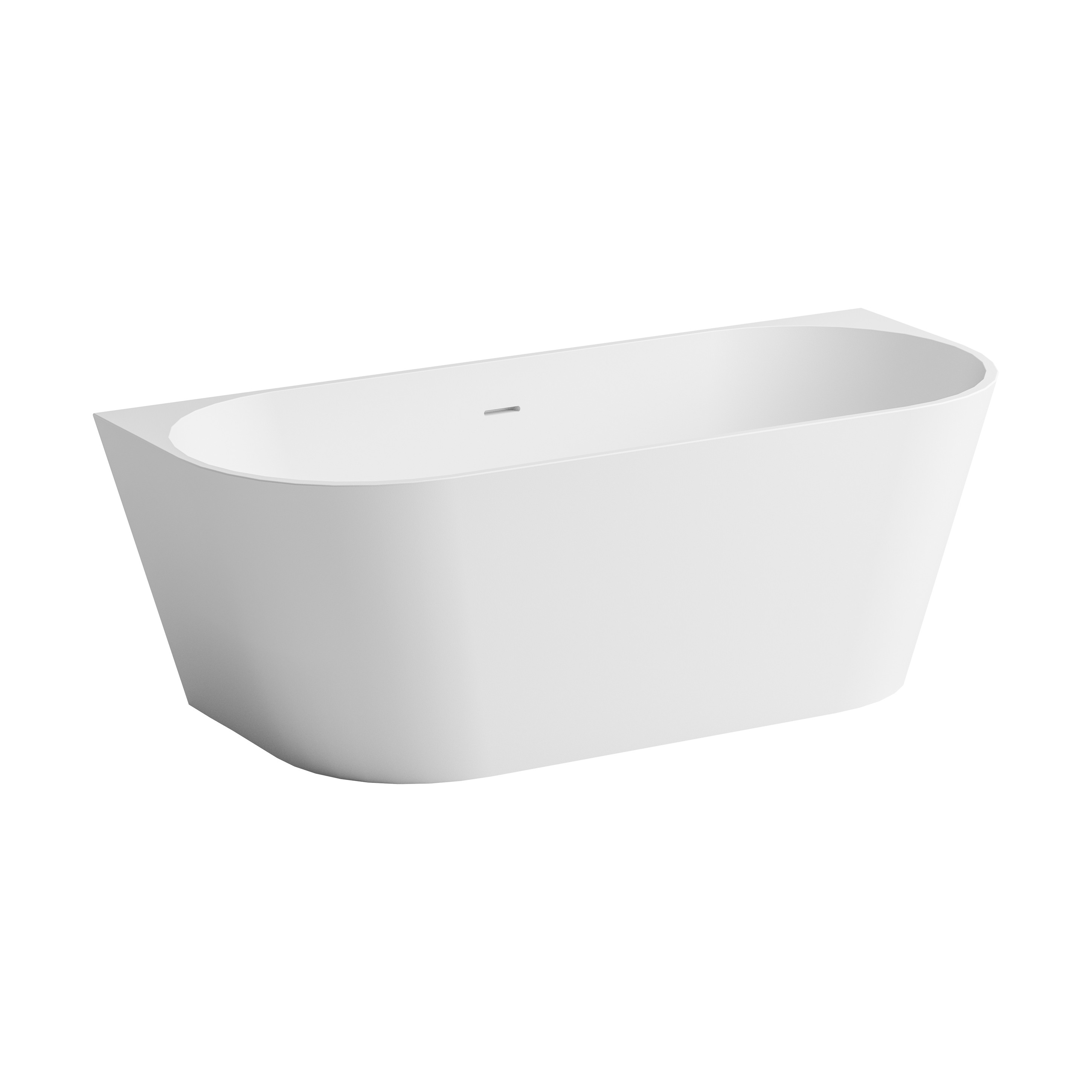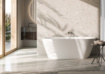 Matt white MineraLite bathtub with soft shape that combines elegance and practicality, for wall installation.