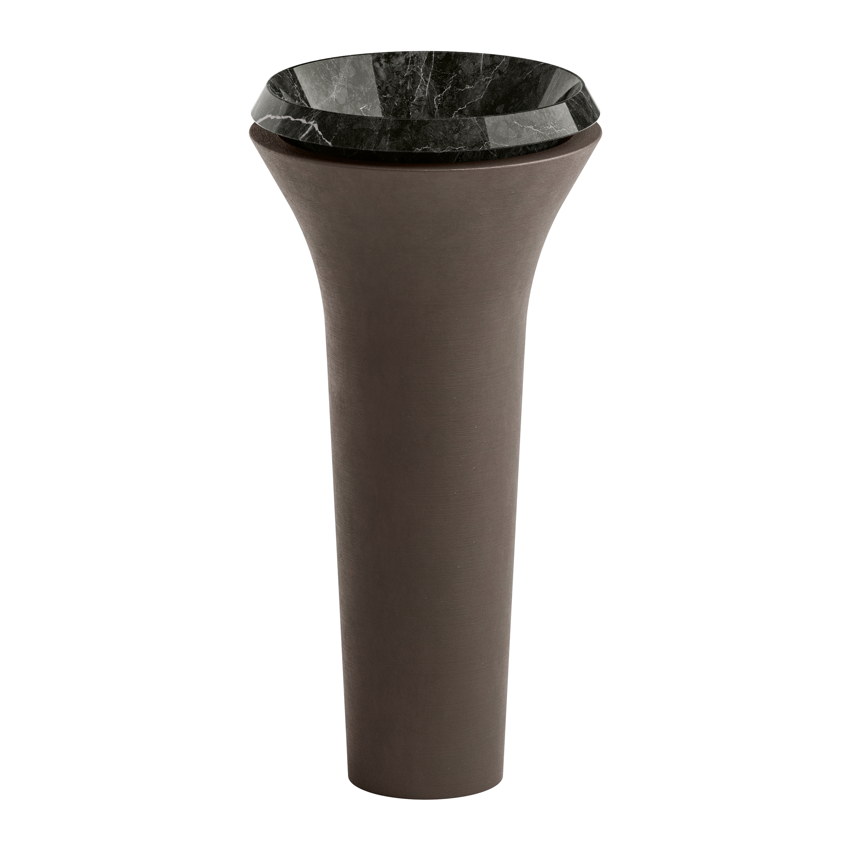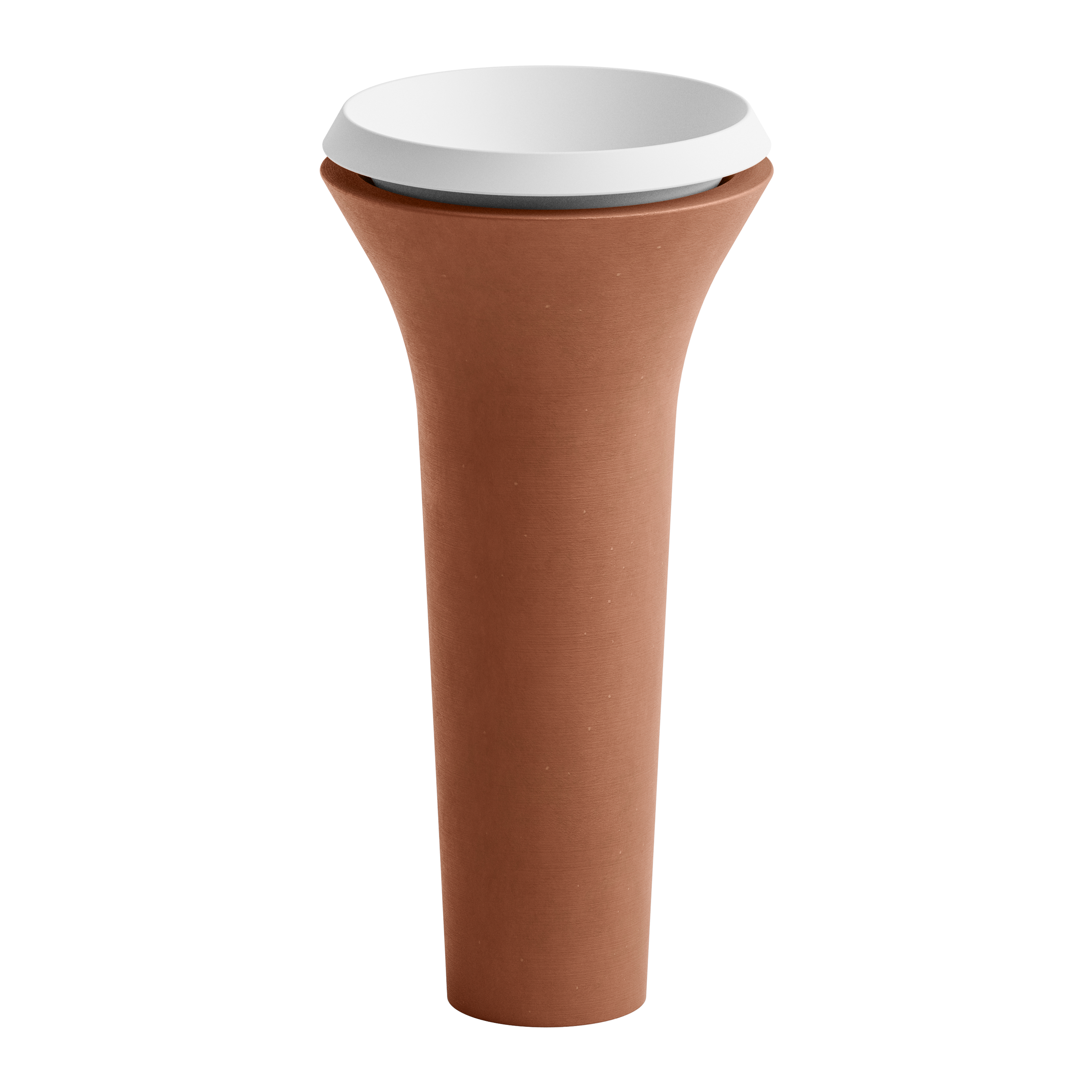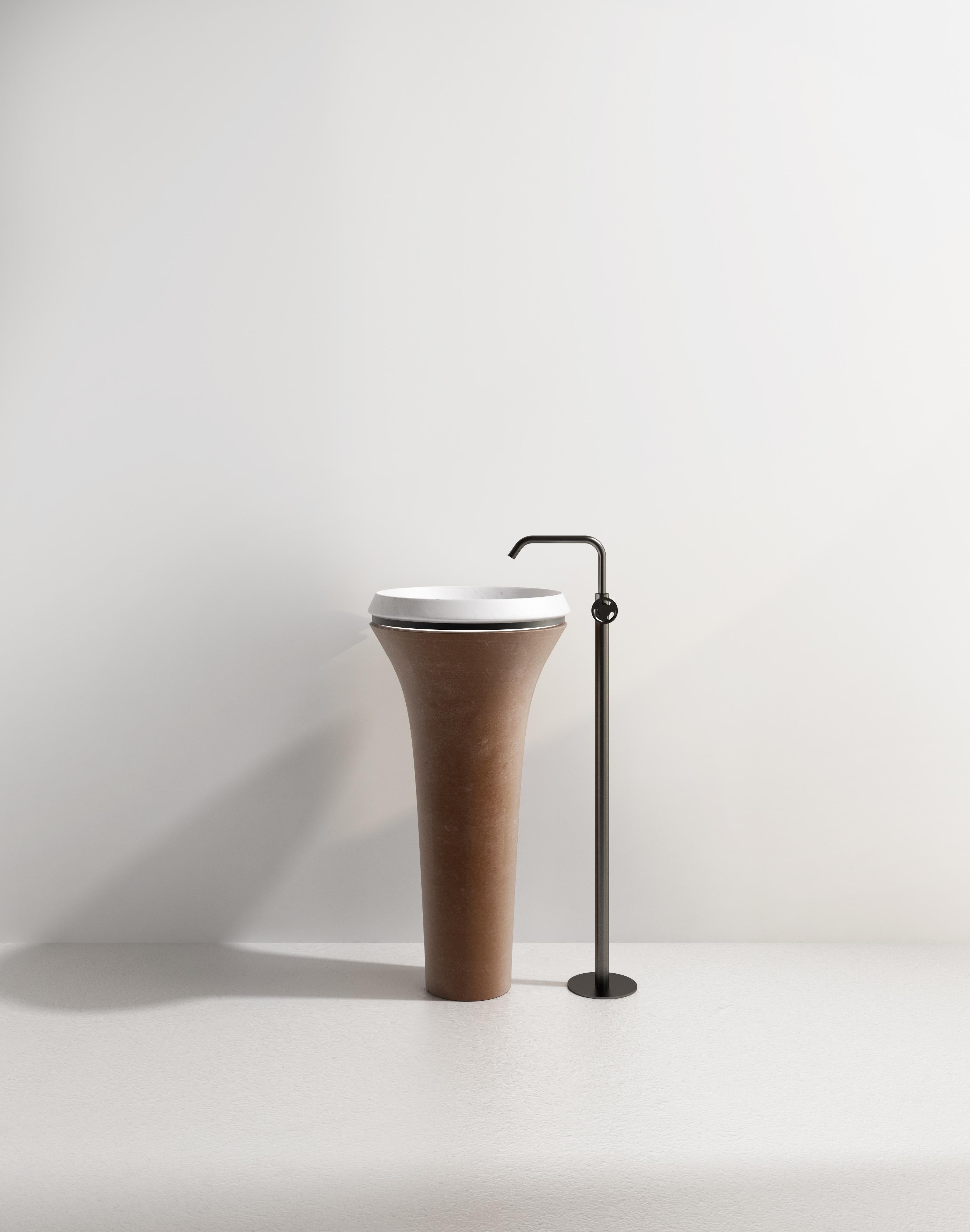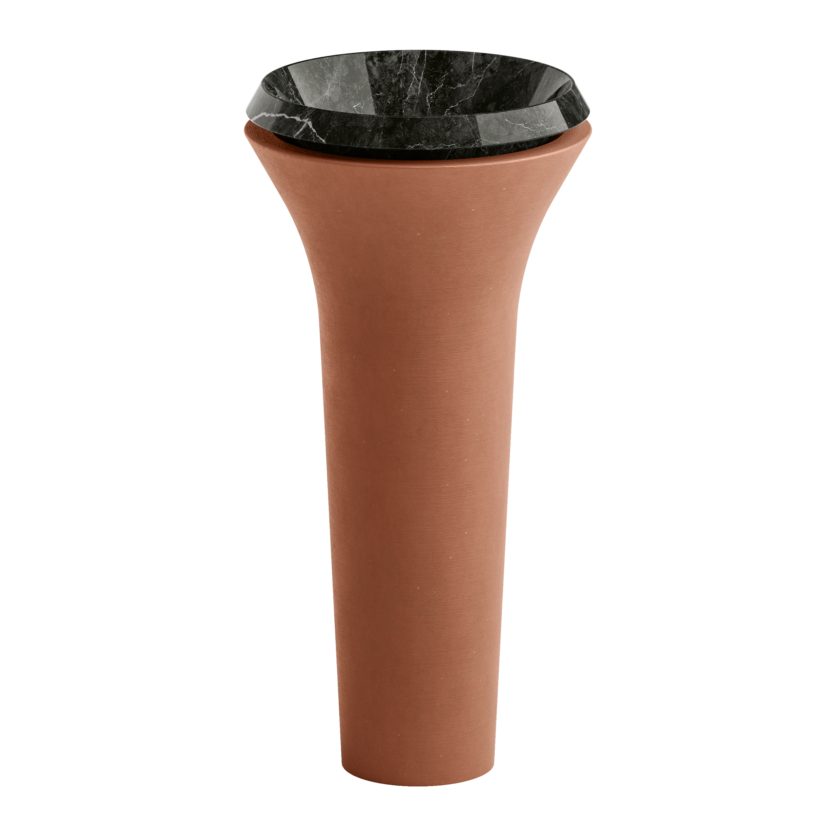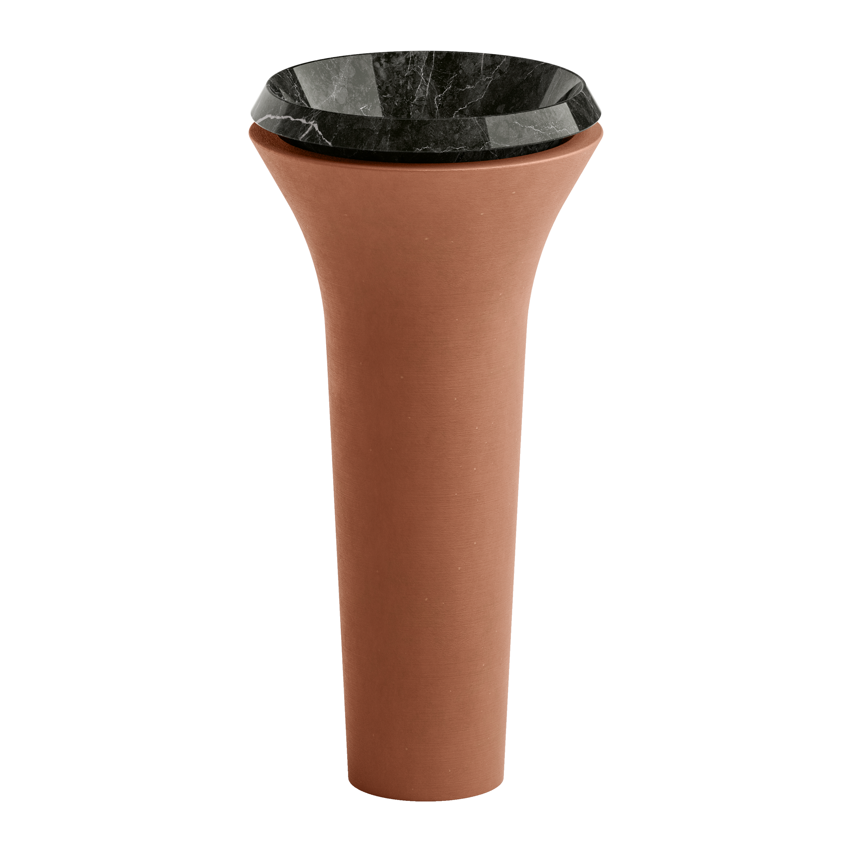 Freestanding washbasin with Catino in Solid Surface or Natural Stone, to be completed with chrome or matt black drain and connection for floor drain. Cotto base available in Brunito and Rosso finishes.