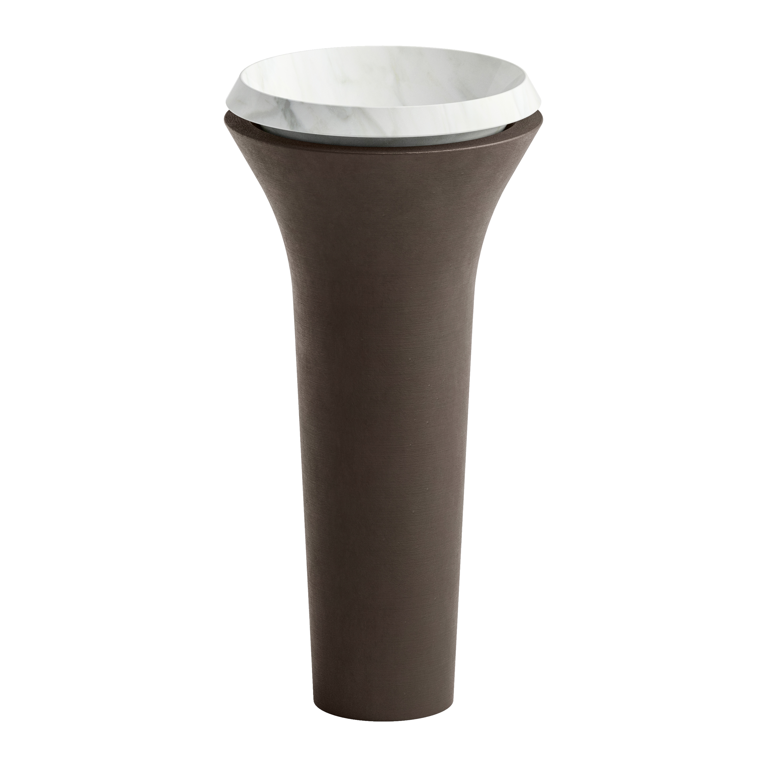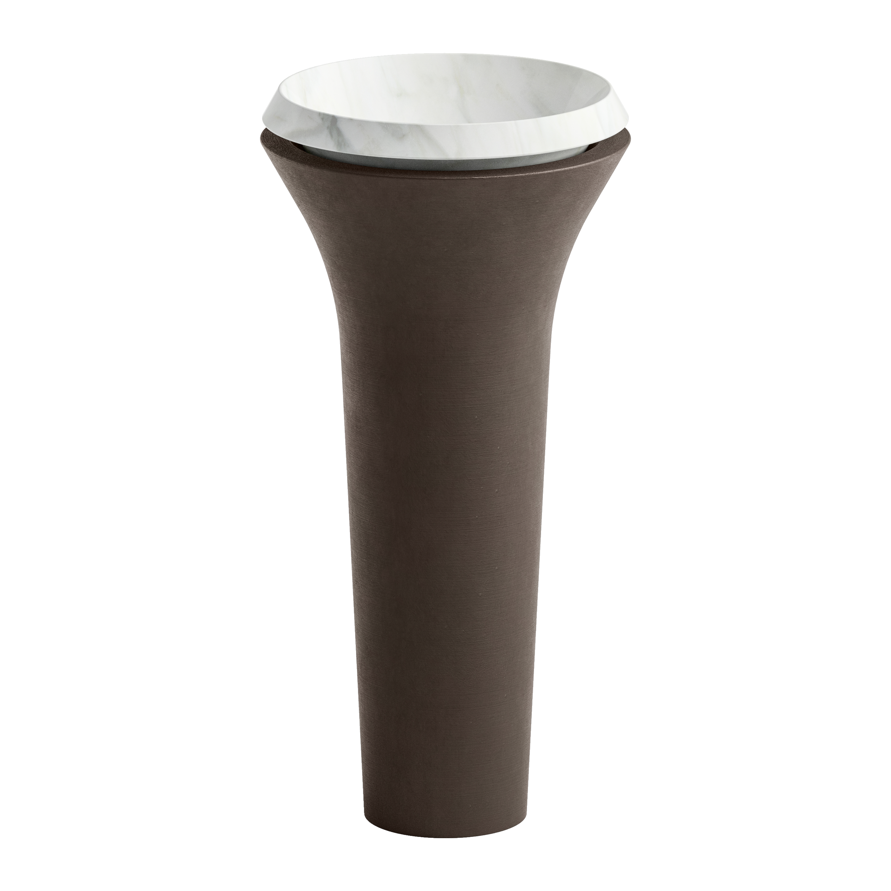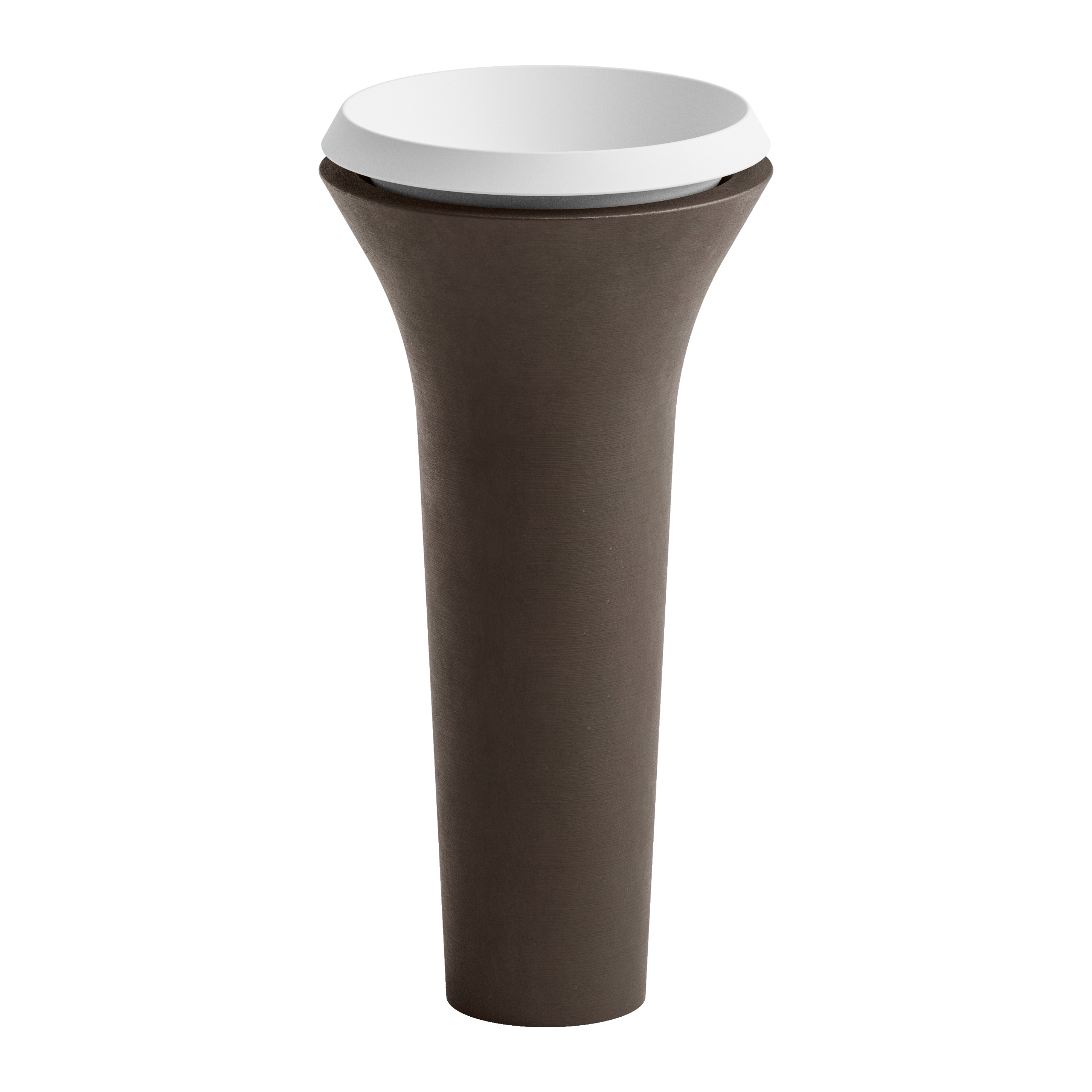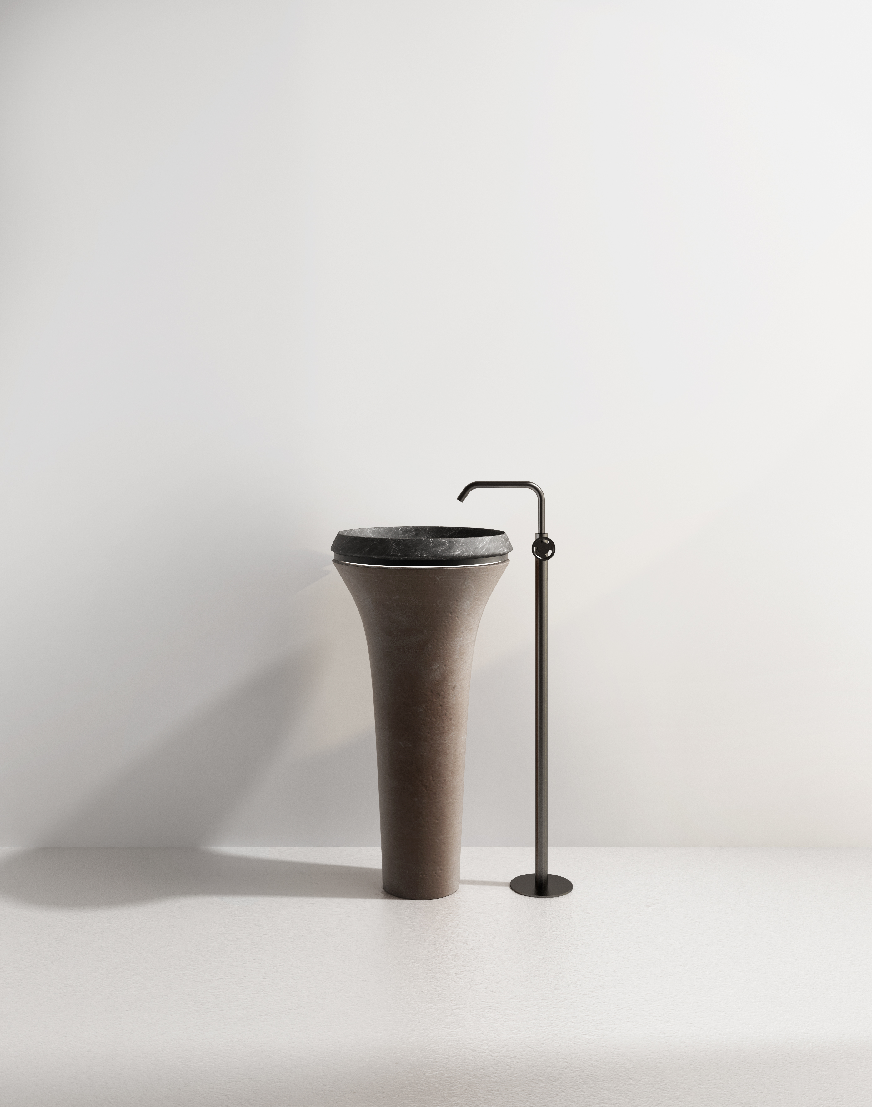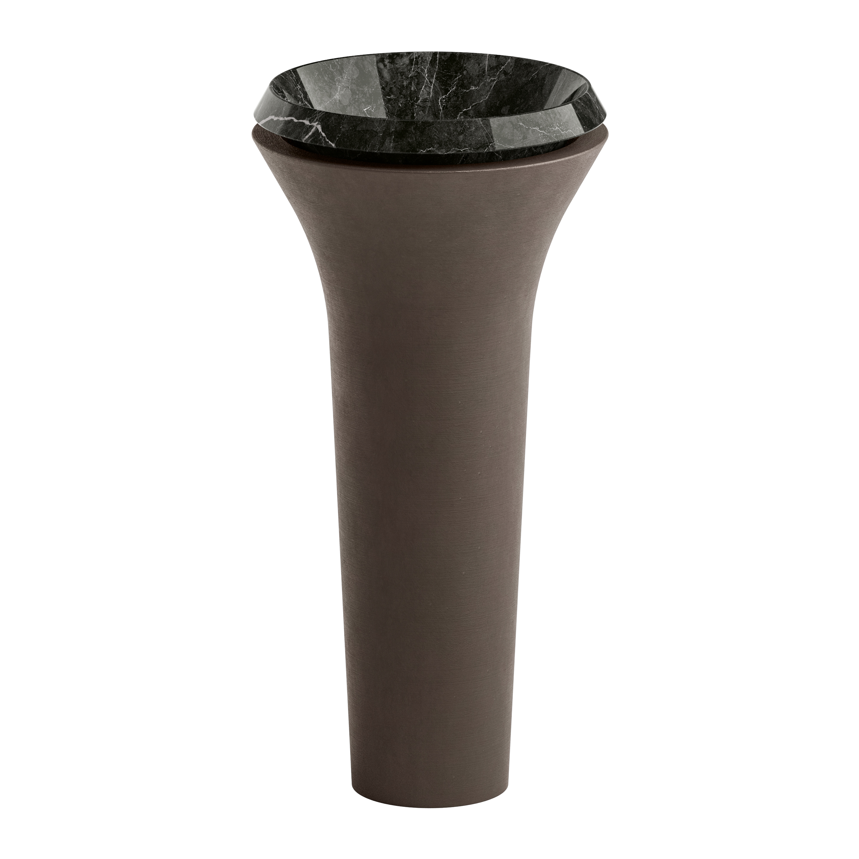 Freestanding washbasin with Catino in Solid Surface or Natural Stone, to be completed with chrome or matt black drain and connection for floor drain. Cotto base available in Brunito and Rosso finishes.