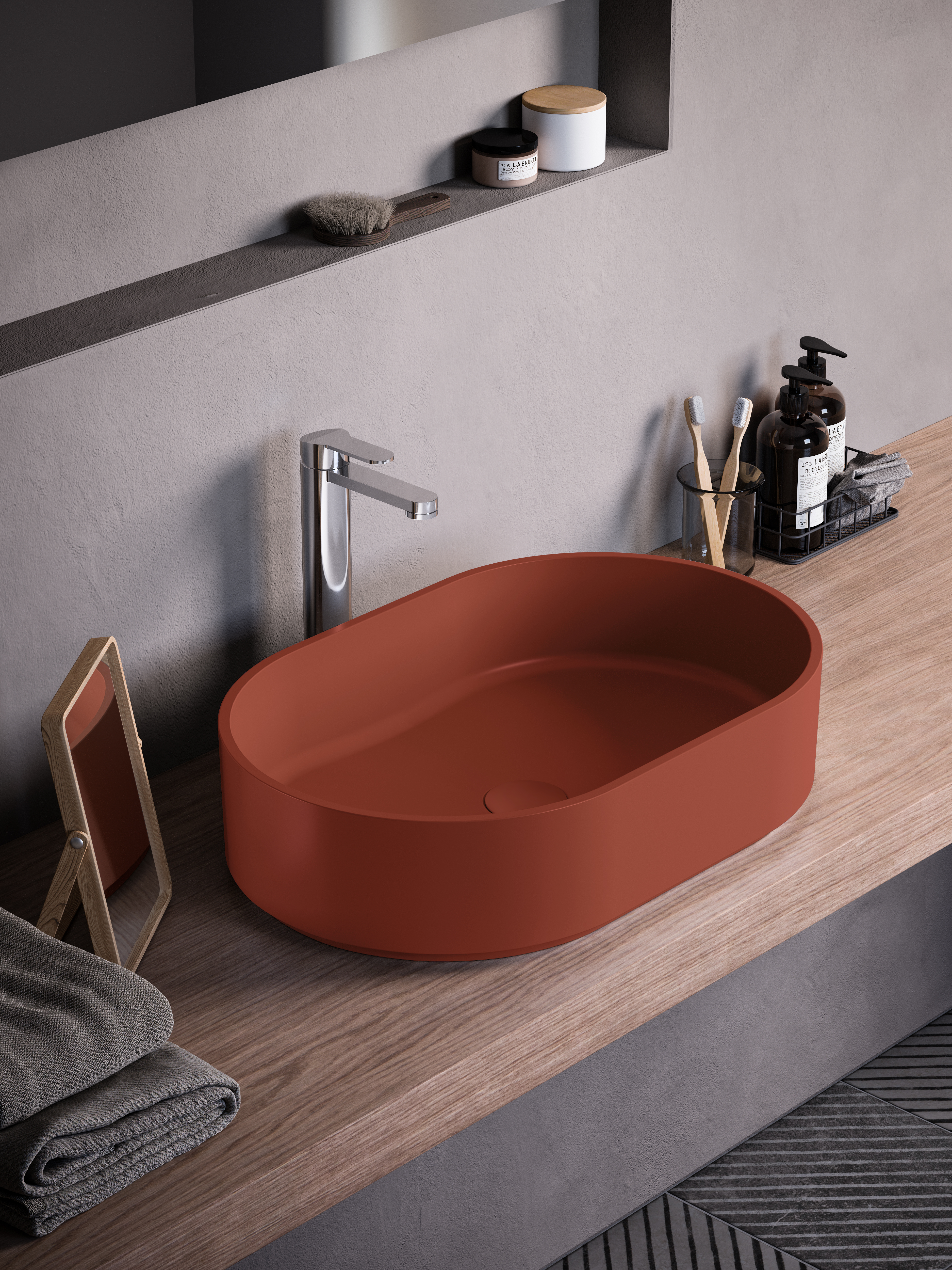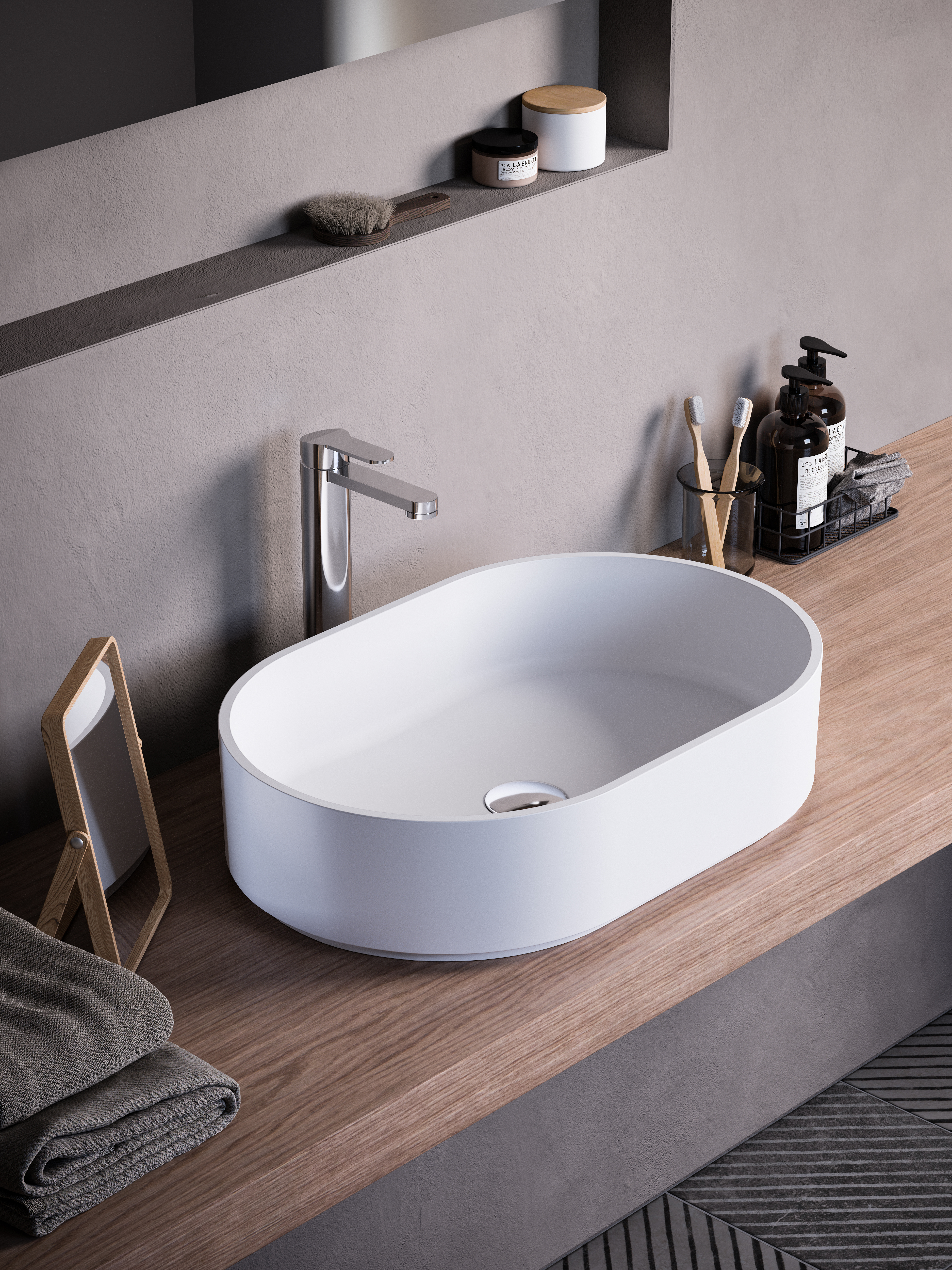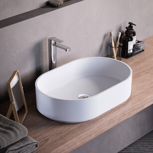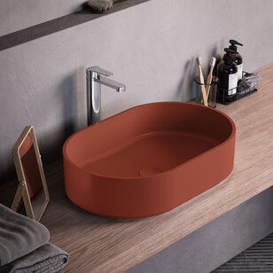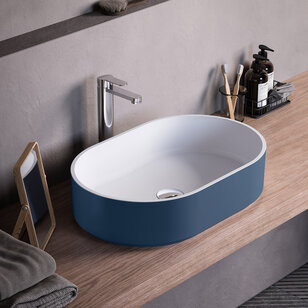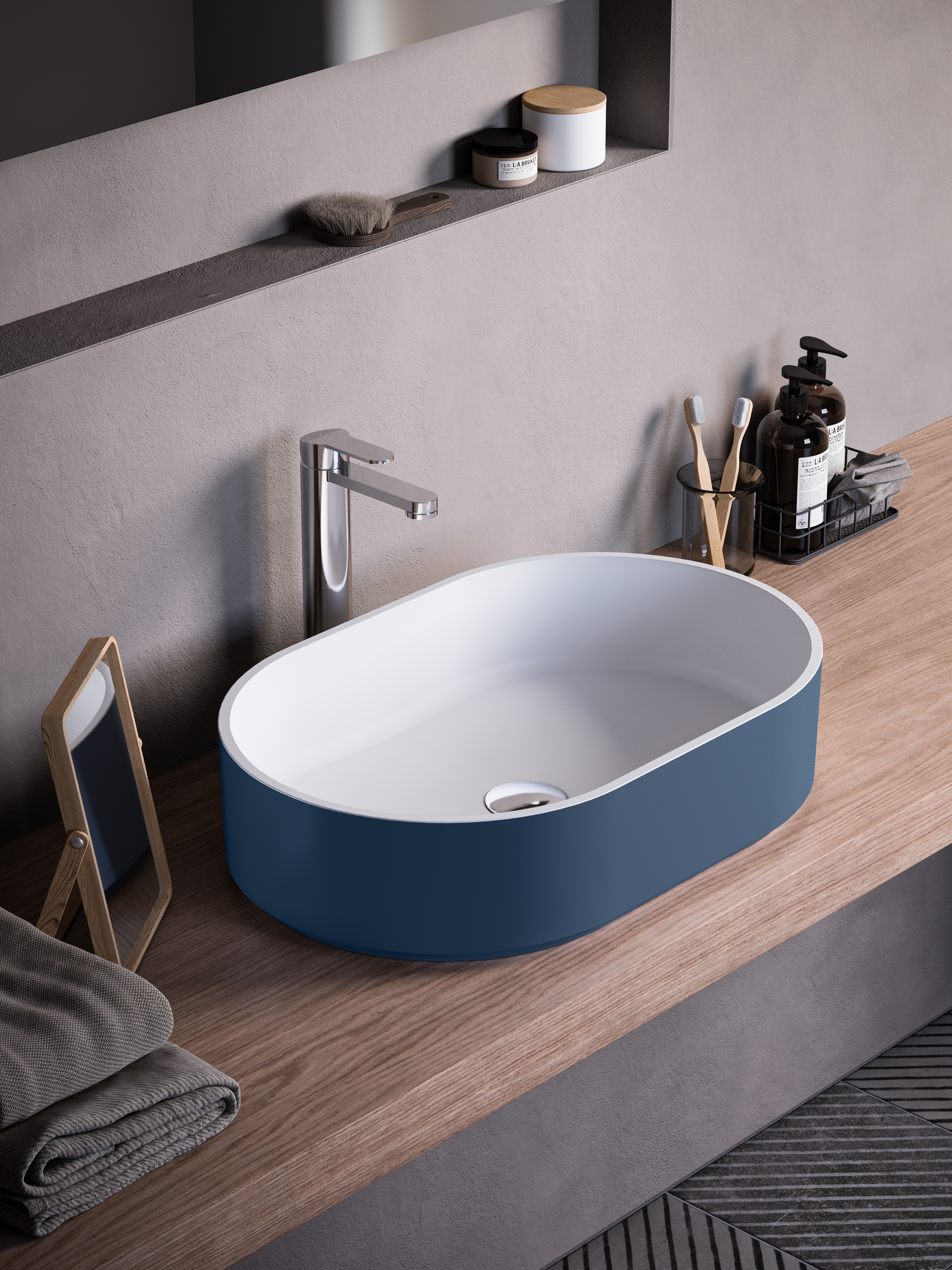 Countertop oval washbasin in matt colored Mineralmarmo or in matt white Solid Surface, with possibility of external Colour finish, glossy or matt.