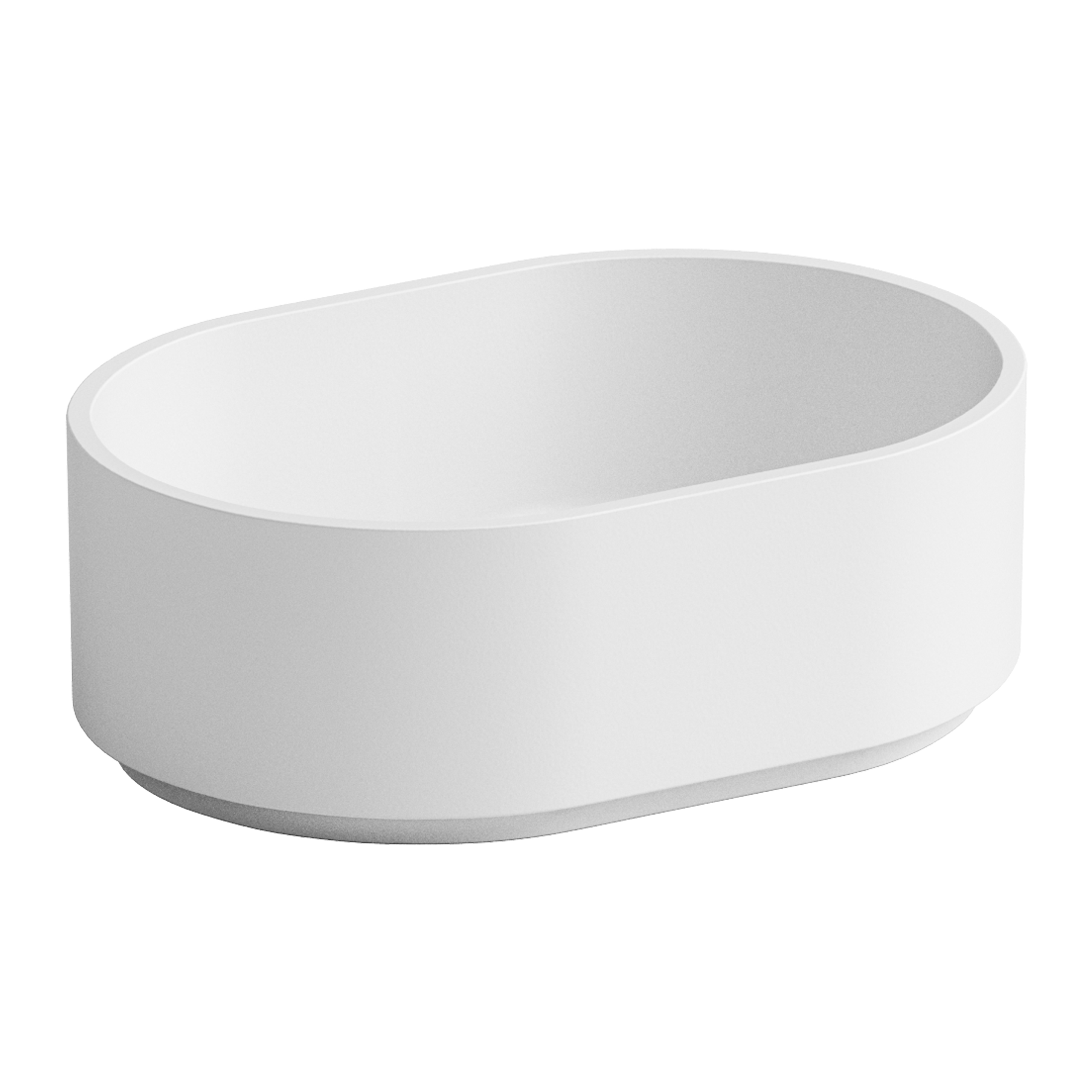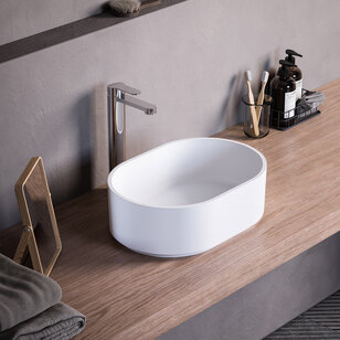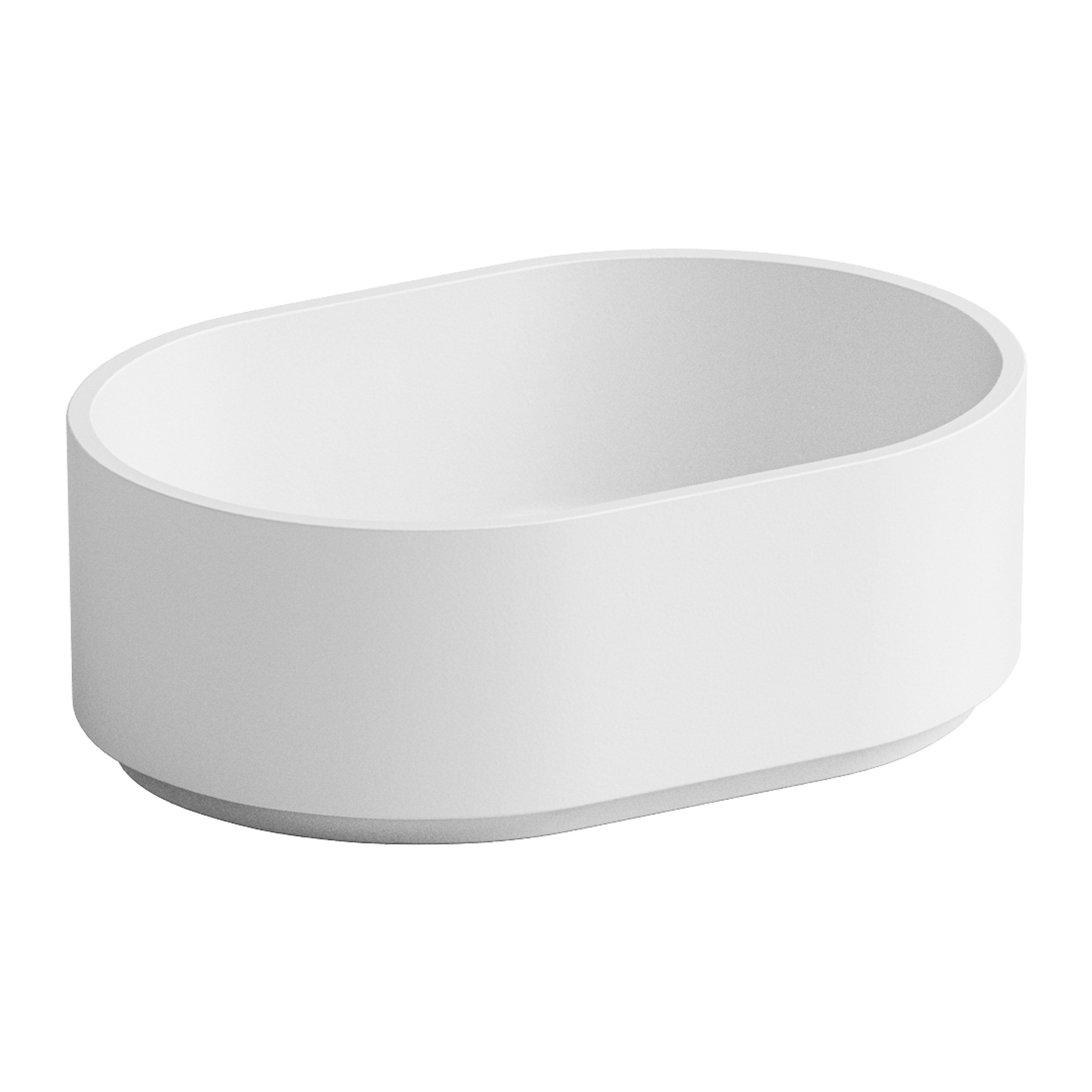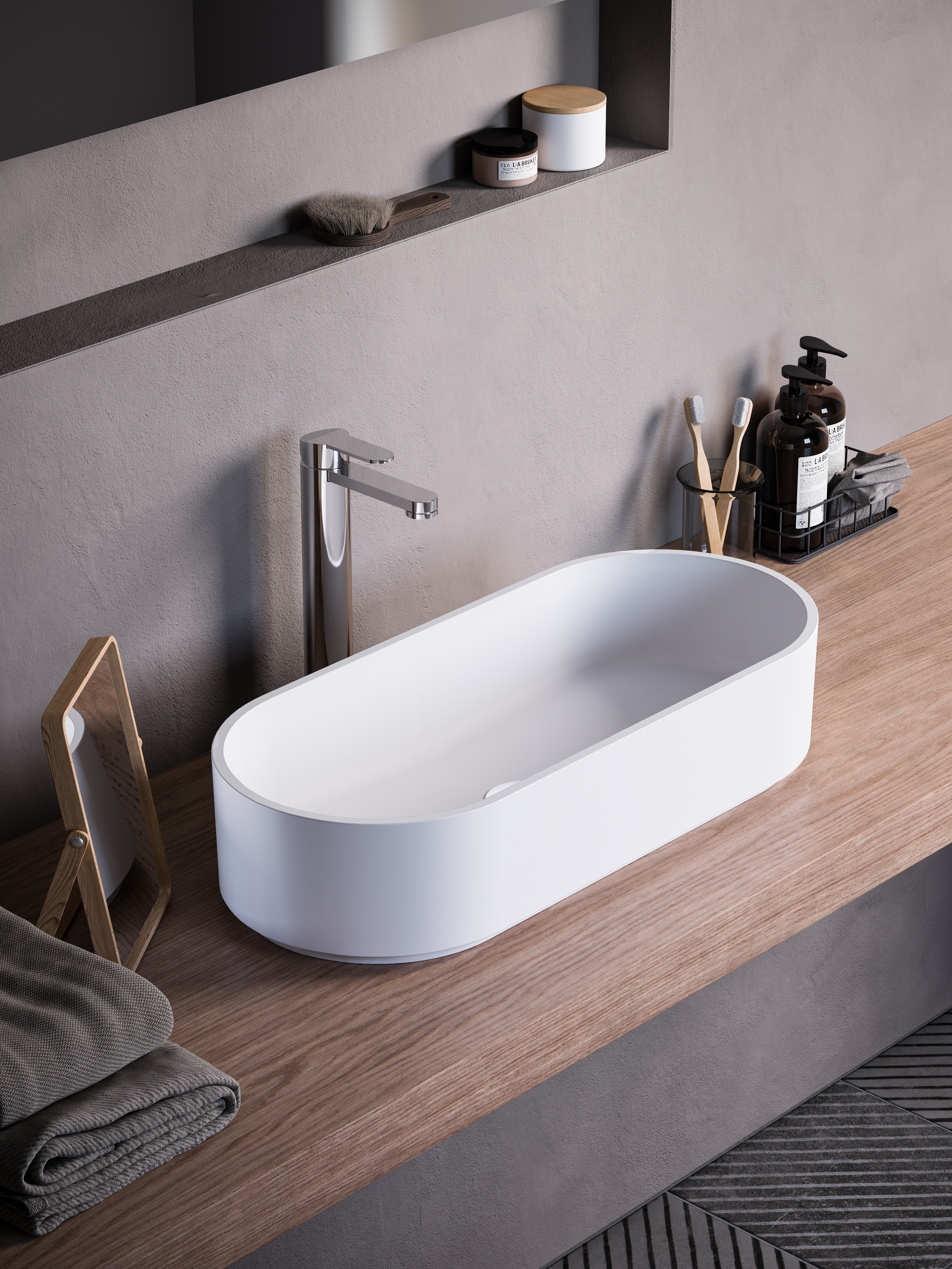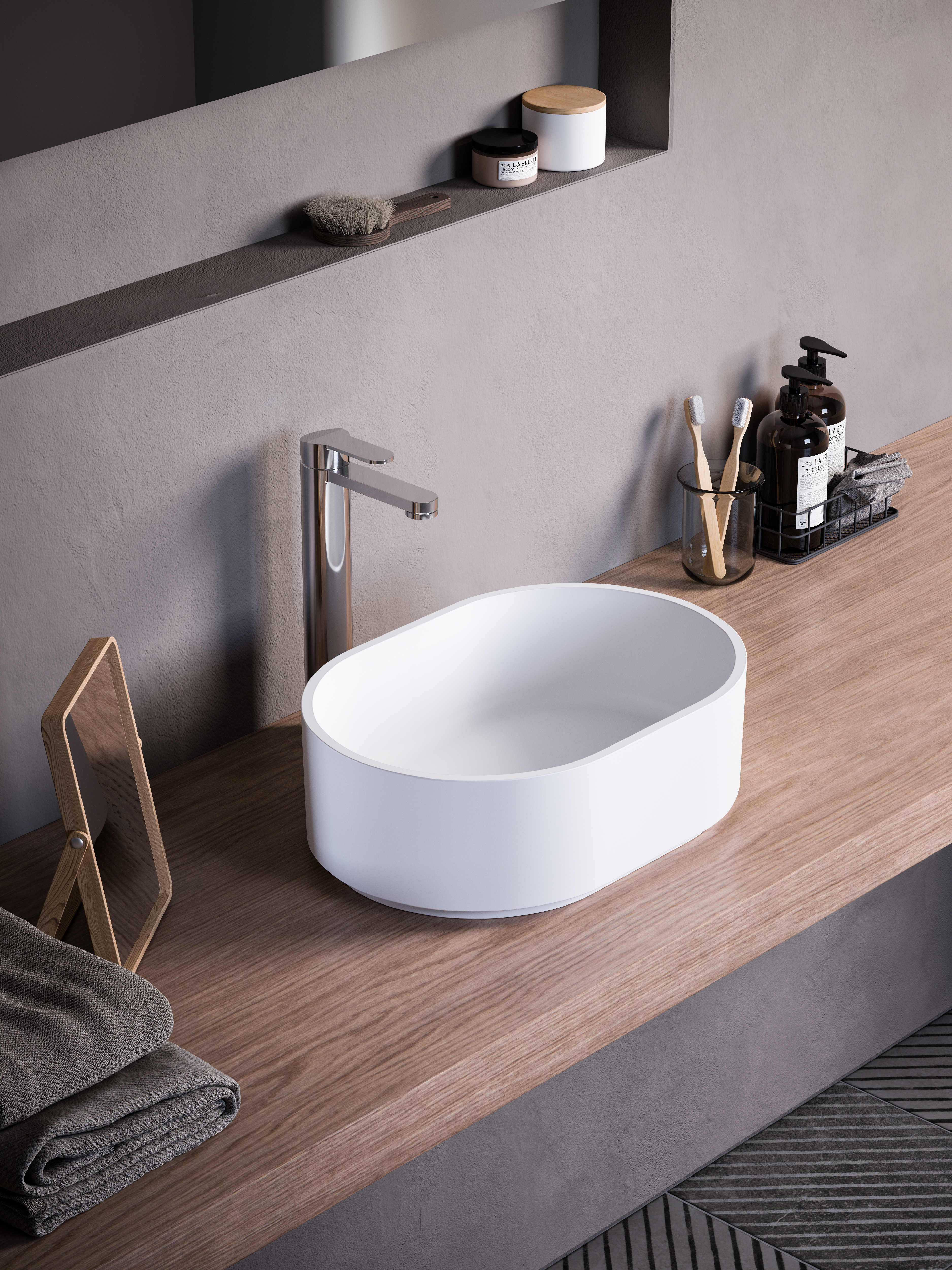 Countertop oval washbasin in matt colored Mineralmarmo or in matt white Solid Surface, with possibility of external Colour finish, glossy or matt.