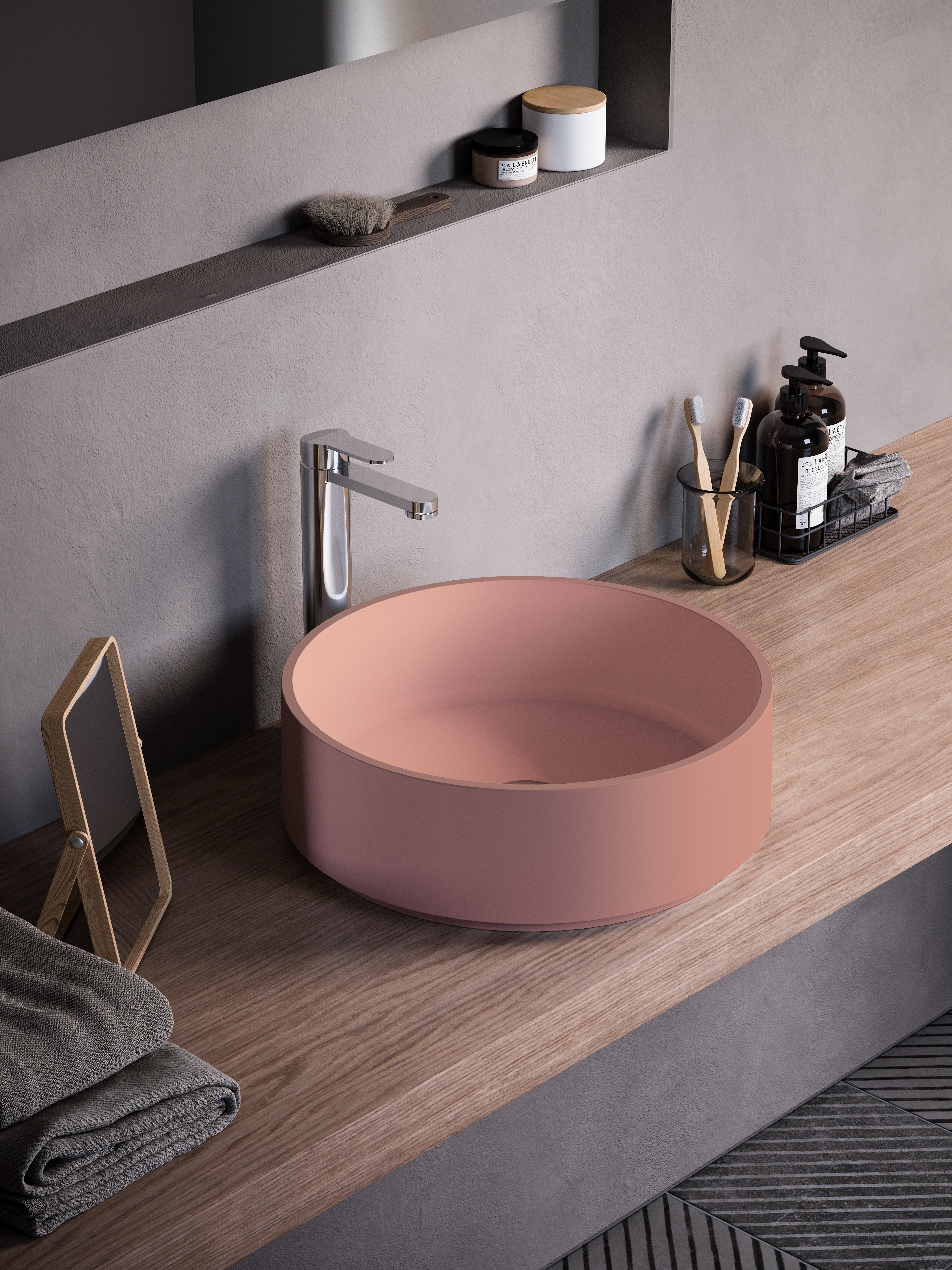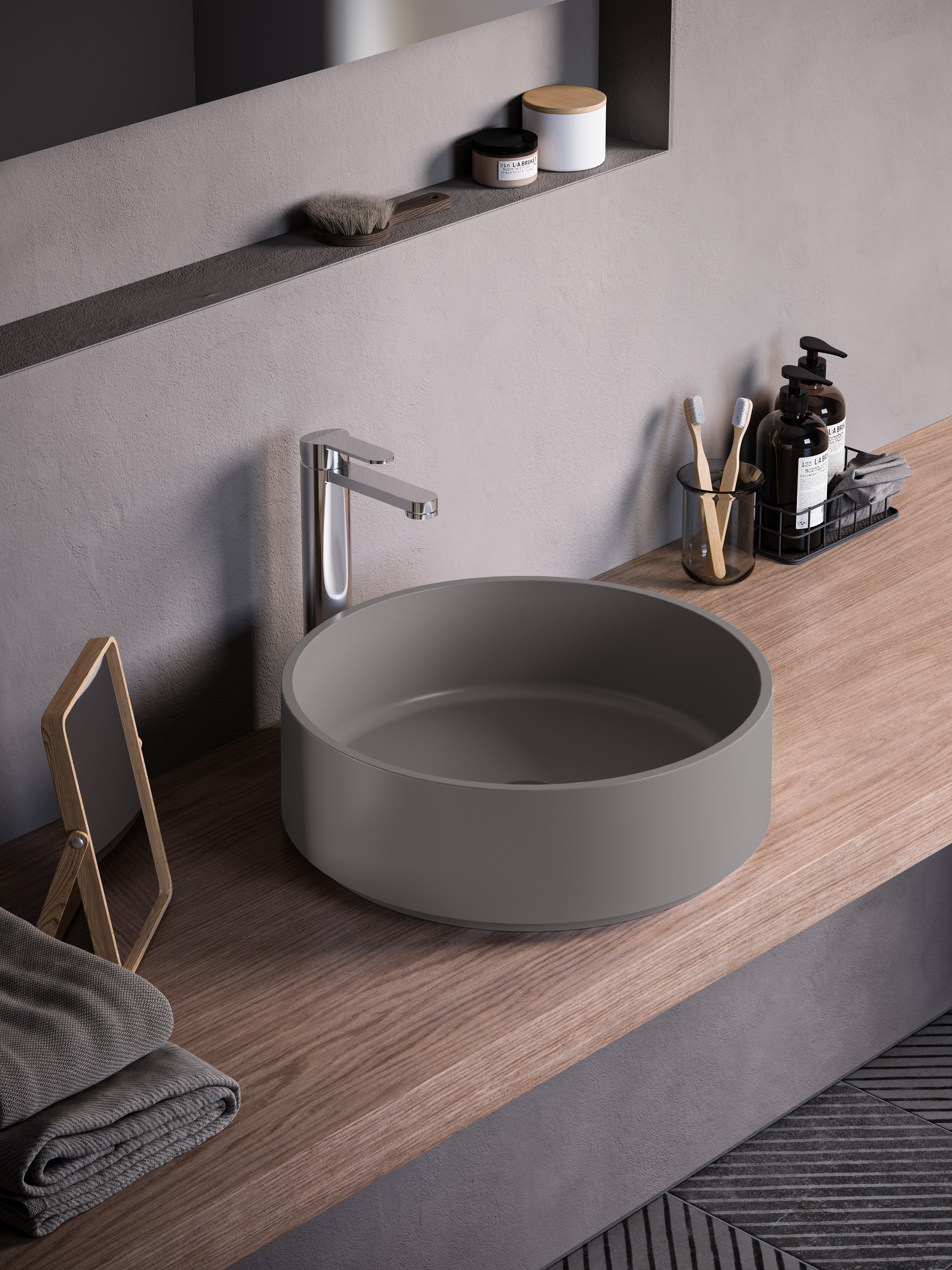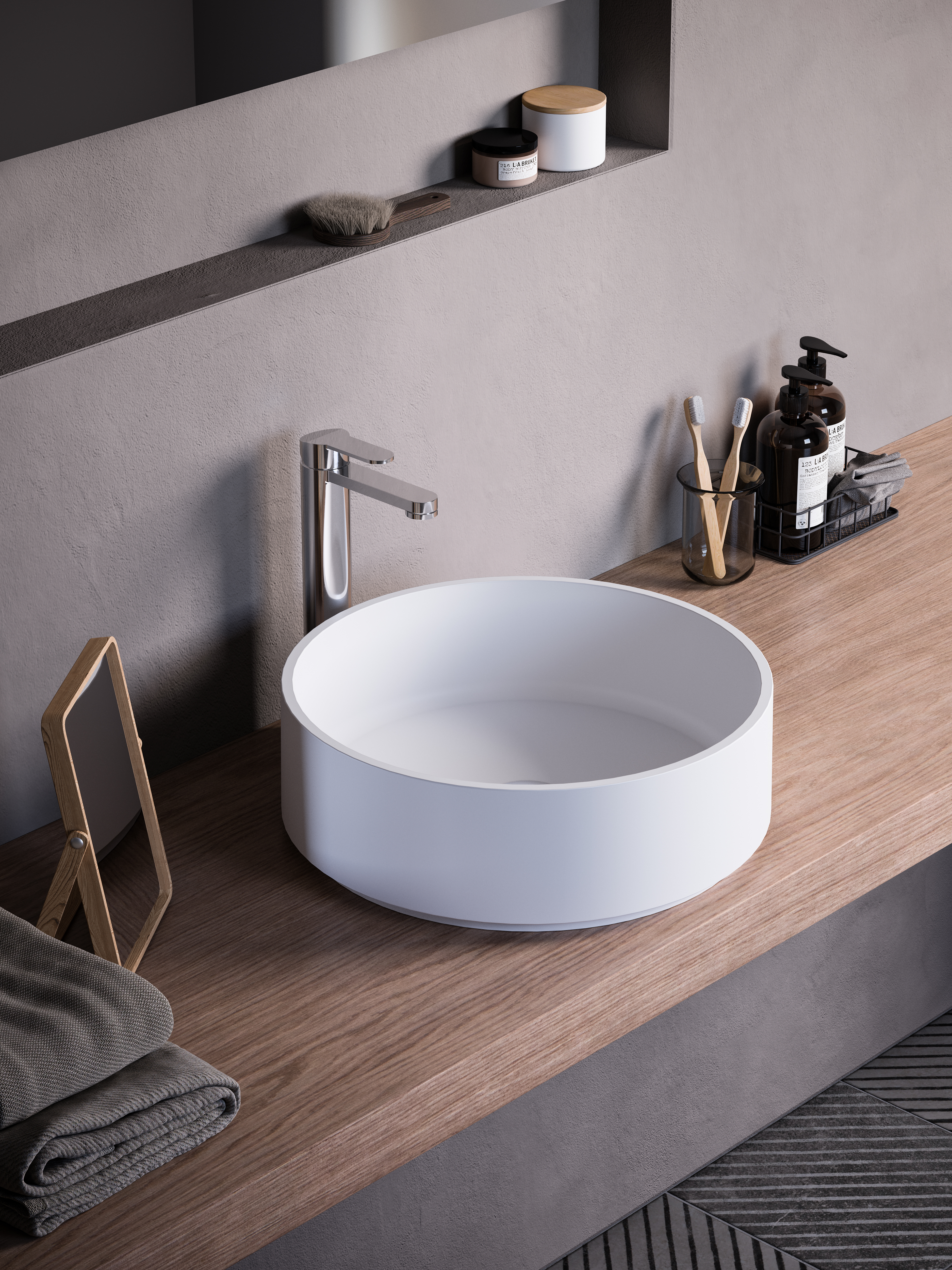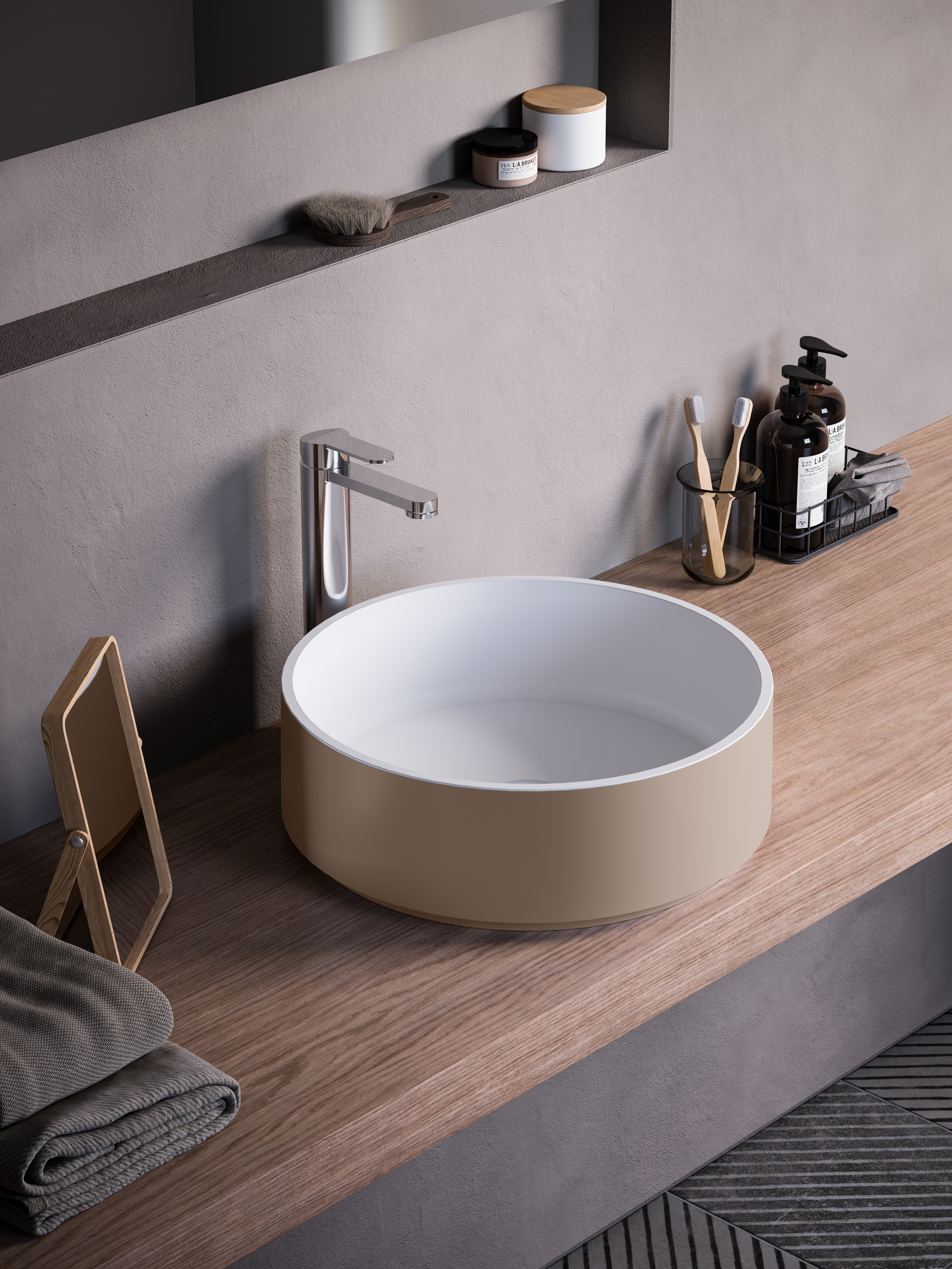 Countertop round washbasin in matt colored Mineralmarmo or in matt white Solid Surface, with possibility of external Colour finish, glossy or matt.