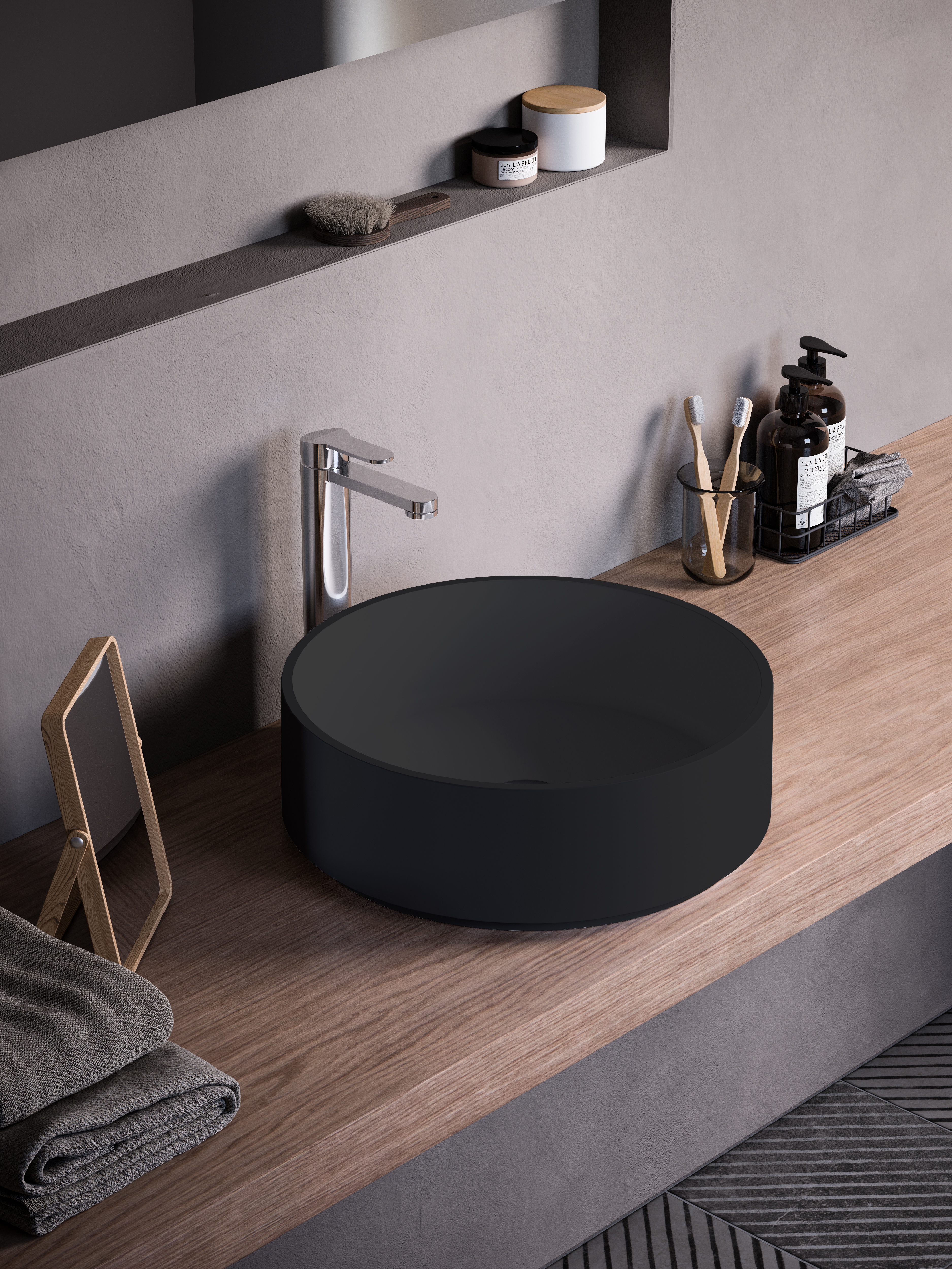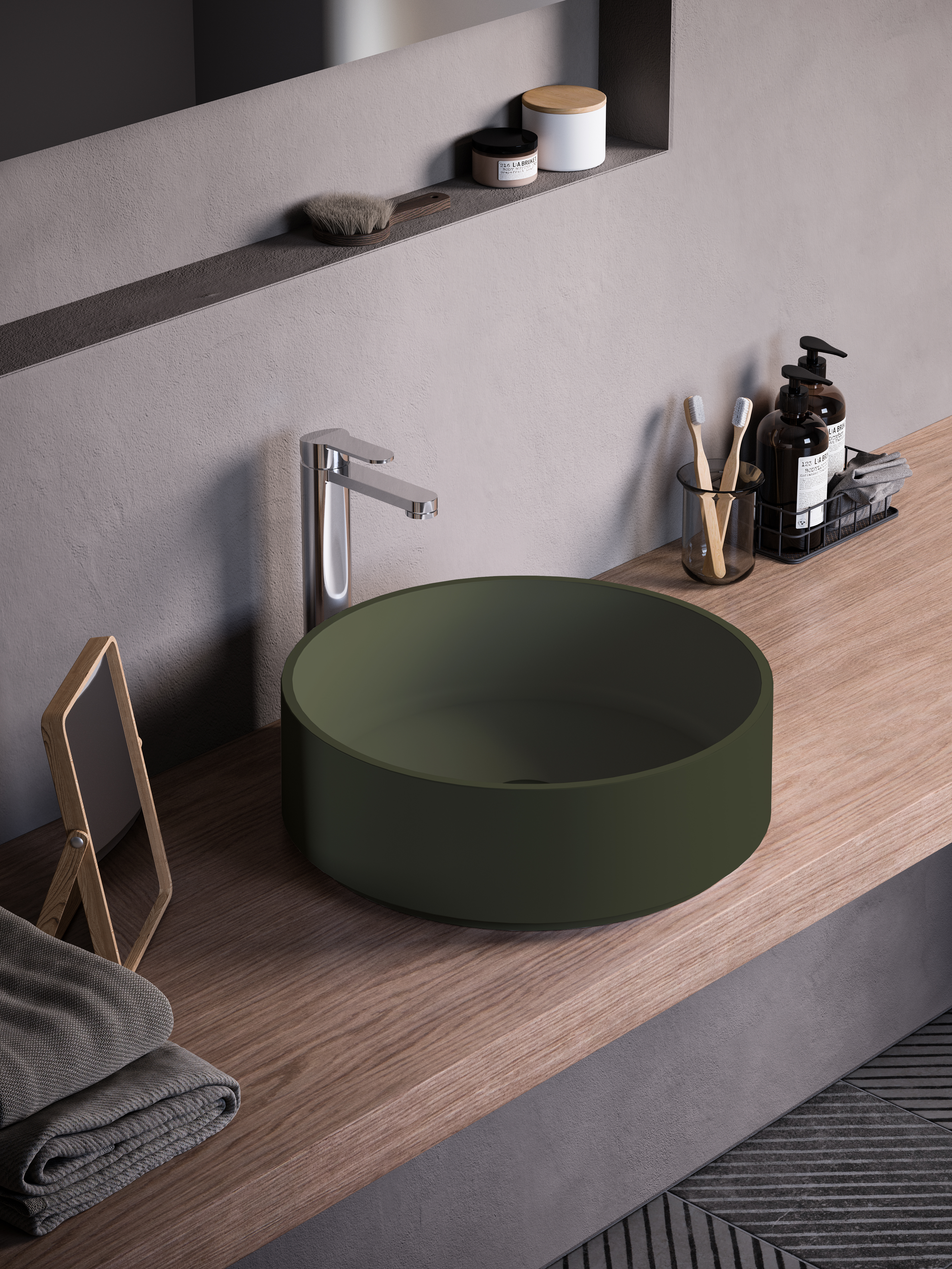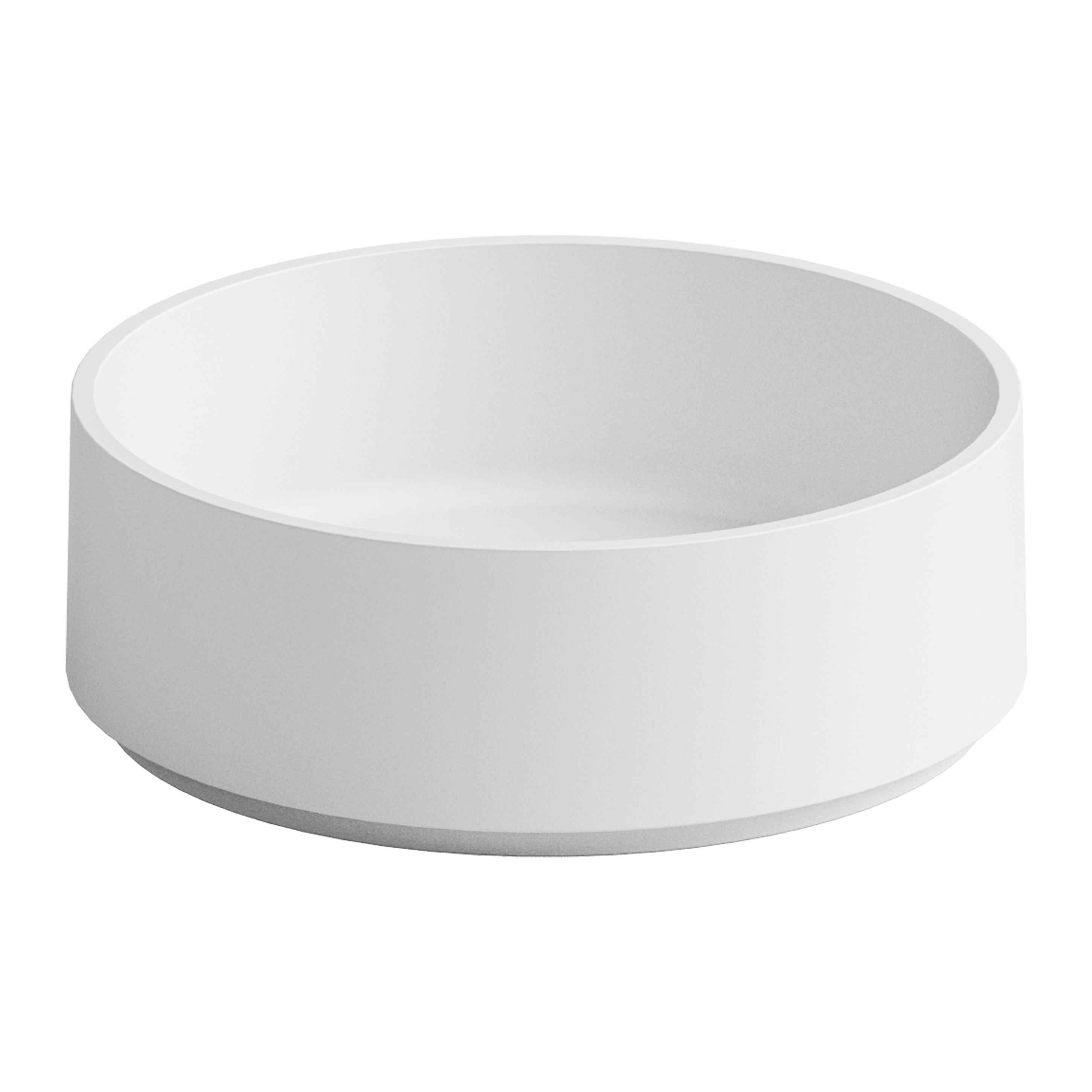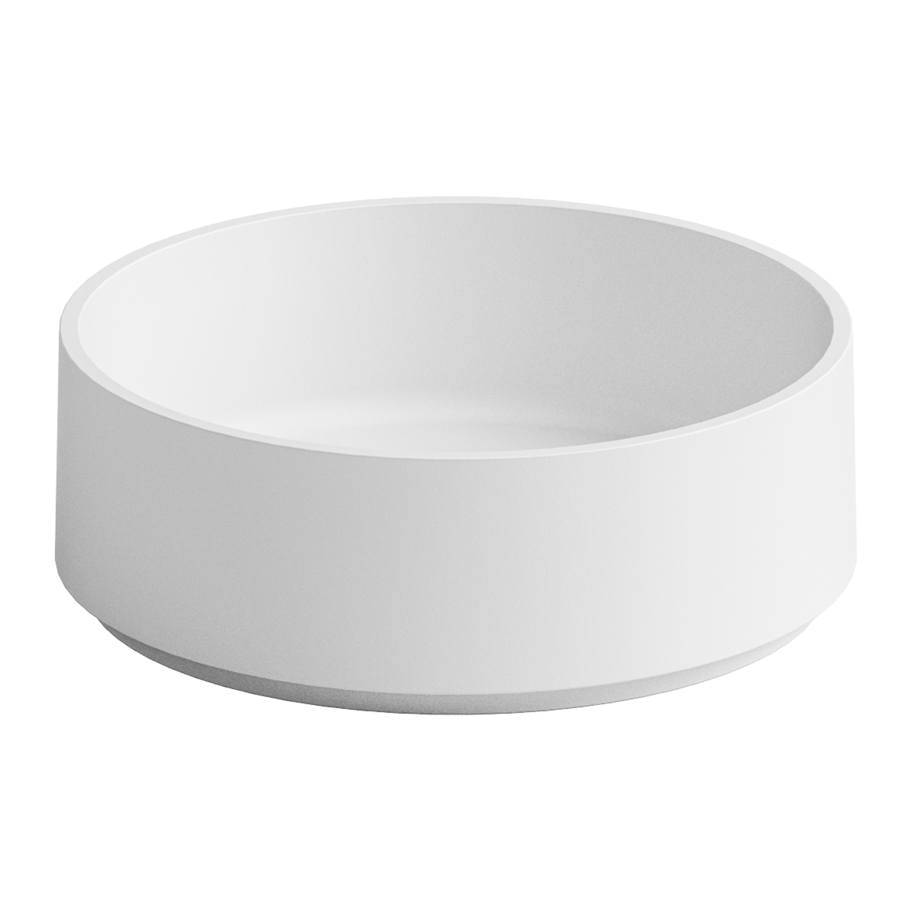 Countertop round washbasin in matt colored Mineralmarmo or in matt white Solid Surface, with possibility of external Colour finish, glossy or matt.