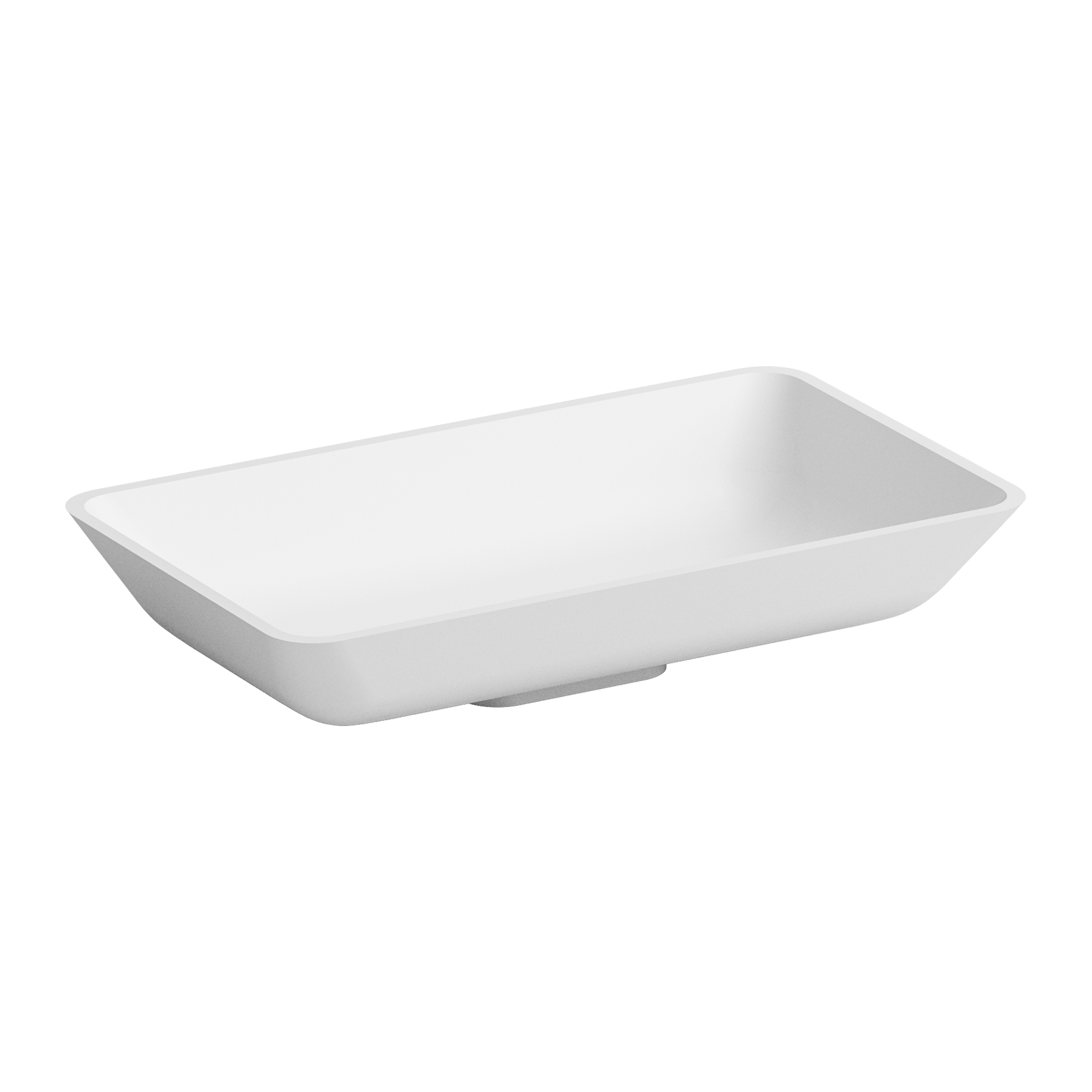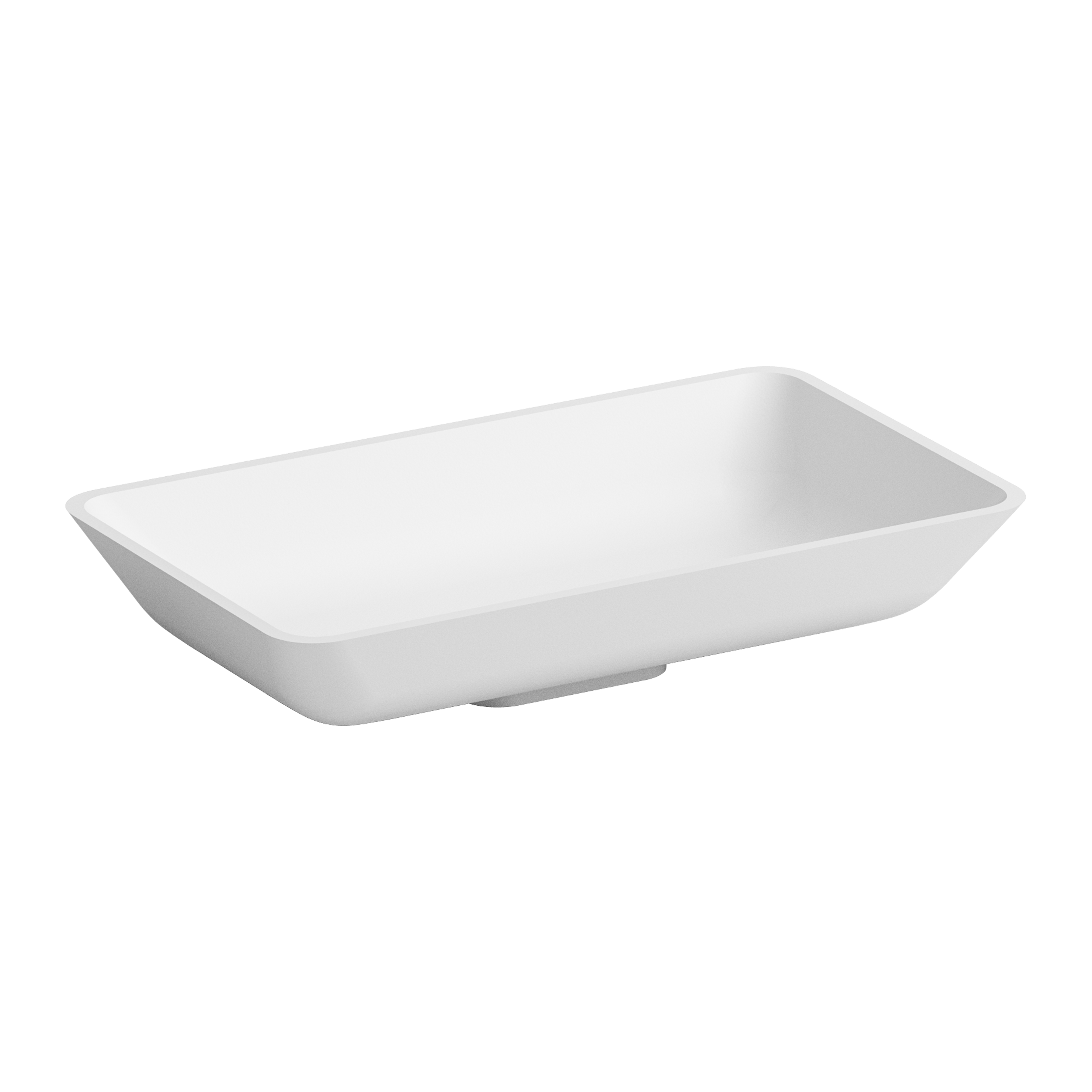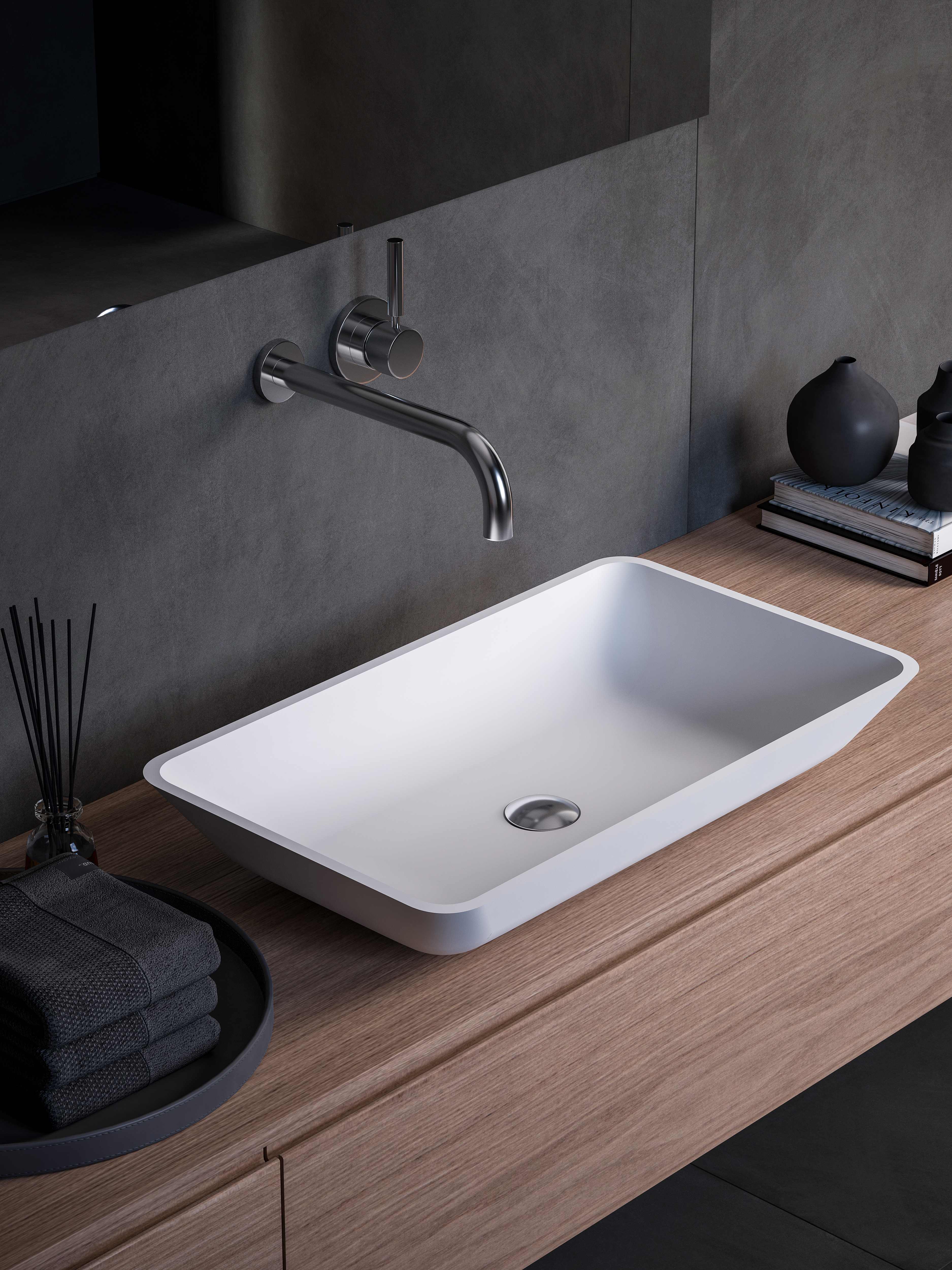 Countertop rectangular washbasin in matt white Solid Surface, with possibility of external Colour finish, glossy or matt.