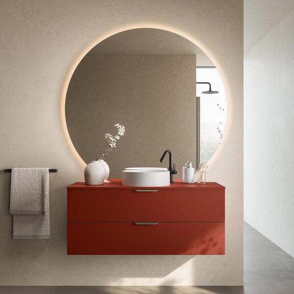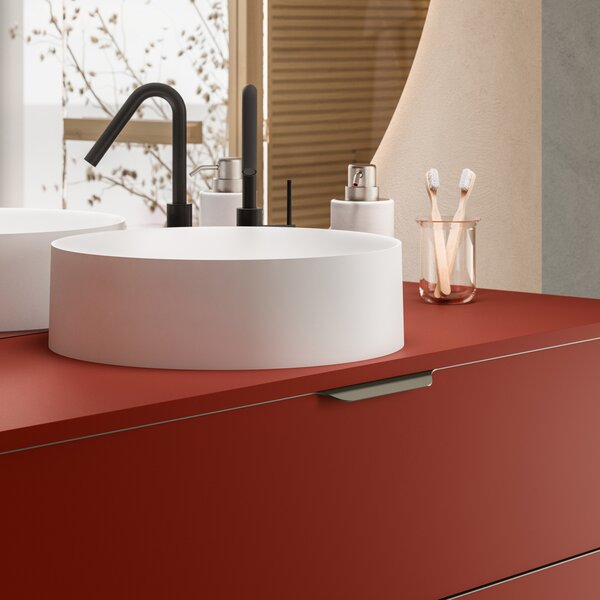 La vasque à poser APTO est réalisée en céramique blanche mate, tandis que le meuble s’associe parfaitement à la baignoire design ANTIGUA, laquée en rouge mat (RAL 3009). La poignée minimaliste du meuble APTO est coordonnée aux profilés en Gun Métal brossés de la douche SOLINO.