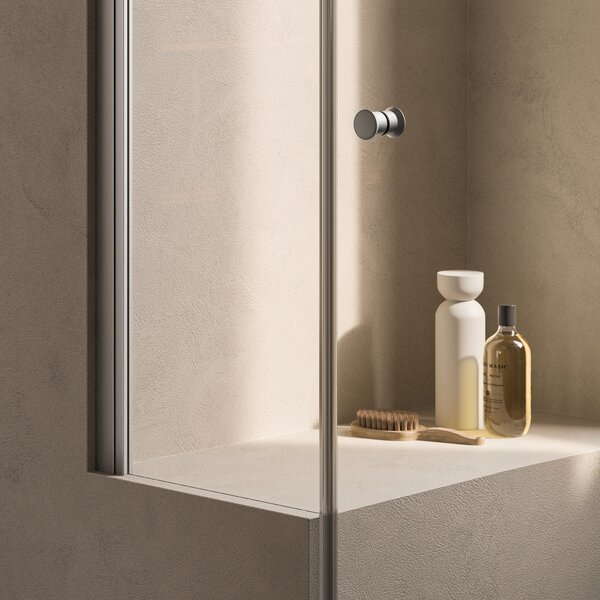 Solution de douche SOLINO en niche avec élégant profilé en Gun Métal brossé et verre transparent, receveur de douche AIR en blanc.