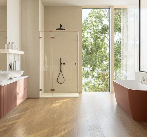 Het kleurenpalet van dit badkamerconcept is warm en uitnodigend, gekenmerkt door natuurlijke tinten en materialen. De verfijnde koperen metalen profielen van de elegante ANNEA-douche vangen en weerkaatsen subtiel het natuurlijke licht, waardoor de doucheopstelling een centrale en opvallende aanwezigheid in de ruimte krijgt.