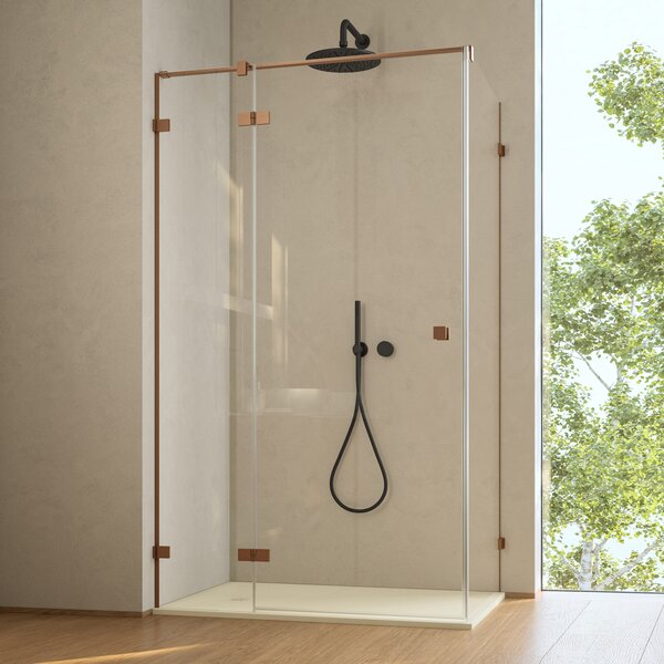 ANNEA hoekdoucheoplossing met elegant geborsteld koperkleurig metalen profiel en transparant glas, en de douchebak AIR in wit. ANNEA is beschikbaar in 6 kleurvarianten, waaronder de nieuwe geborstelde metaalafwerkingen: geborsteld Gun Metal, geborsteld nikkel en geborsteld goud.
