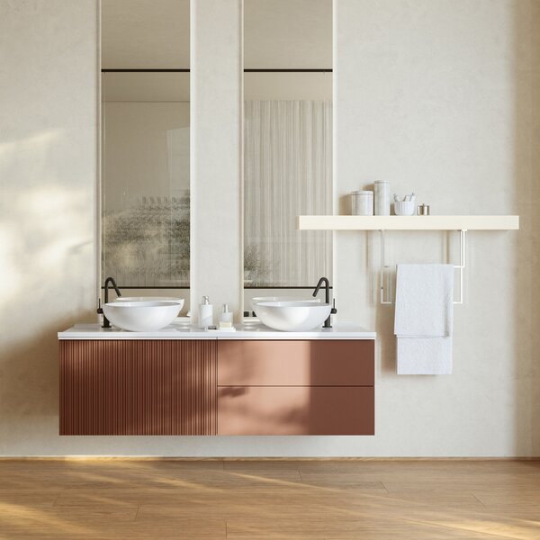 Het RIGO-blad met opbouwwastafel is afgewerkt in Mineralmarmo glanzend Ivory L192, terwijl de kasten de warme bruintint van de GUADELOUPE badkuip in RAL 8002 weerspiegelen.