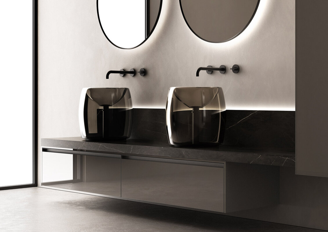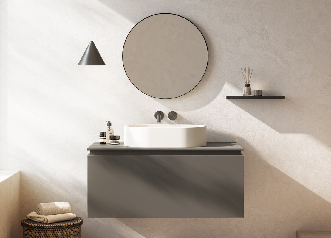 Najważniejsze jest sprecyzowanie wielkości umywalki, bo ma być wygodna w użytkowaniu, a przy tym nie zaburzać proporcji wnętrza. Kluczowe są też wymiary blatu pod umywalkę nablatową, bo umywalka nie może być od niego większa.